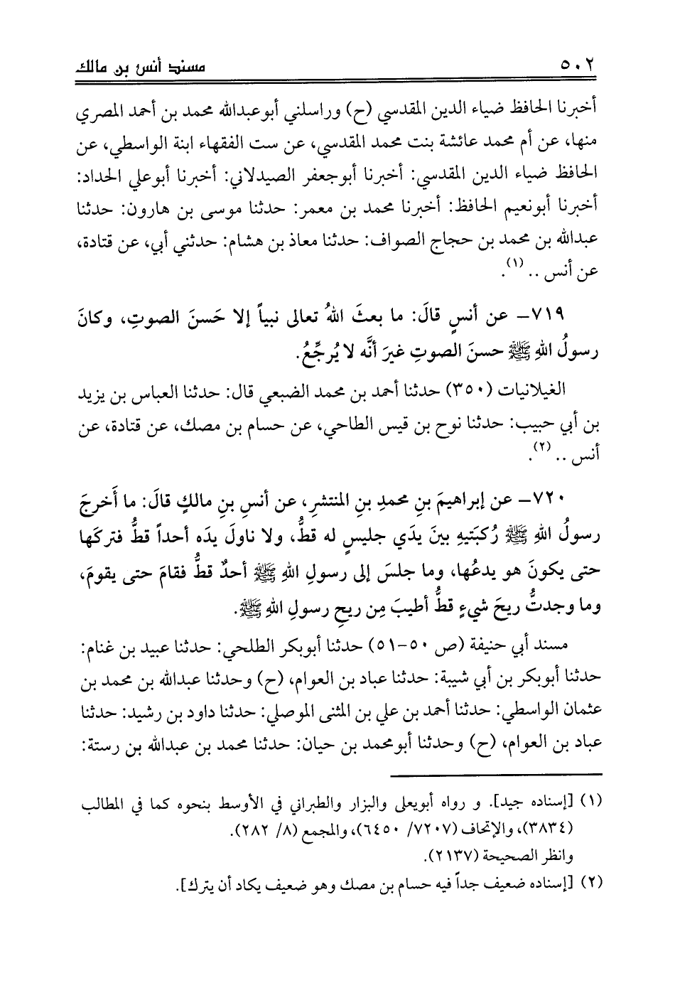 أخبرنا الحافظ ضياء الدين المقدسي (ح) وراسلني أبوعبدالله محمد بن أحمد المصري منها، عن أم محمد عائشة بنت محمد المقدسي، عن ست الفقهاء ابنة الواسطي، عن الحافظ ضياء الدين المقدسي: أخبرنا أبوجعفر الصيدلاني: أخبرنا أبوعلي الحداد: أخبرنا أبونعيم الحافظ: أخبرنا محمد بن معمر: حدثنا موسى بن هارون: حدثنا عبدالله بن محمد بن حجاج الصواف: حدثنا معاذ بن هشام: حدثنى أبي، عن قتادة، عن أنس .. (¬1).