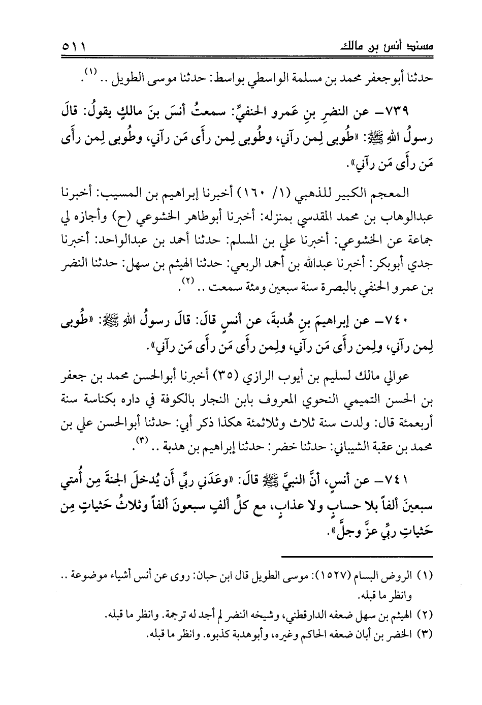 739 - عن النضرِ بنِ عَمرو الحنفيِّ: سمعتُ أنسَ بنَ مالكٍ يقولُ: قالَ رسولُ اللهِ صلى الله عليه وسلم: «طُوبى لِمن رآني، وطُوبى لِمن رأَى مَن رآني، وطُوبى لِمن رأَى مَن رأَى مَن رآني».