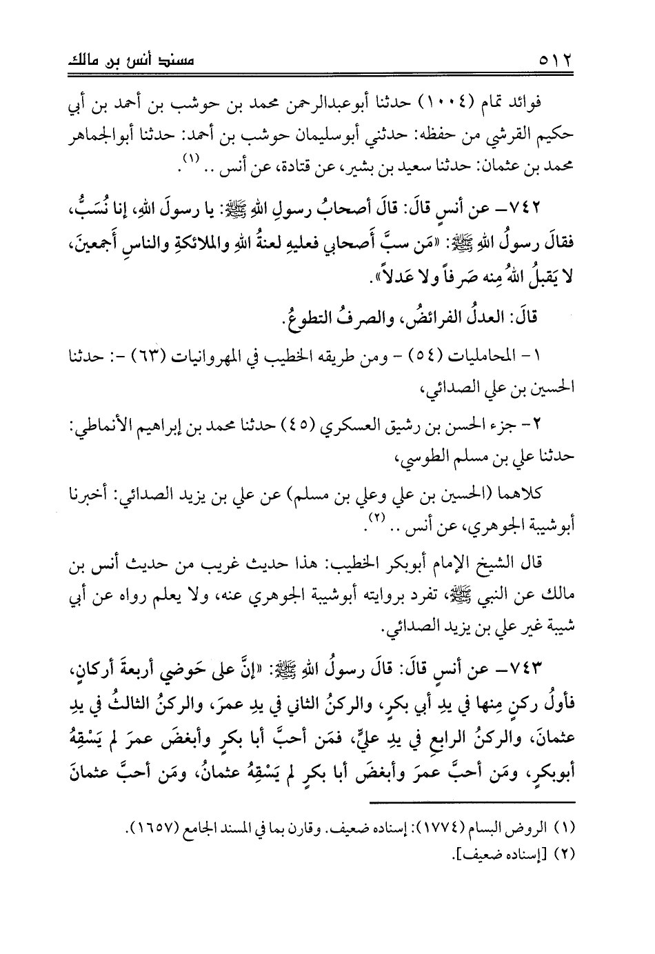 743 - عن أنسٍ قالَ: قالَ رسولُ اللهِ صلى الله عليه وسلم: «إنَّ على حَوضي أربعةَ أركانٍ، فأولُ ركنٍ مِنها في يدِ أبي بكرٍ، والركنُ الثاني في يدِ عمرَ، والركنُ الثالثُ في يدِ عثمانَ، والركنُ الرابعِ في يدِ عليٍّ، فمَن أحبَّ أبا بكرٍ وأبغضَ عمرَ لم يَسْقِهُ أبوبكرٍ، ومَن أحبَّ عمرَ وأبغضَ أبا بكرٍ لم يَسْقِهُ عثمانُ، ومَن أحبَّ عثمانَ