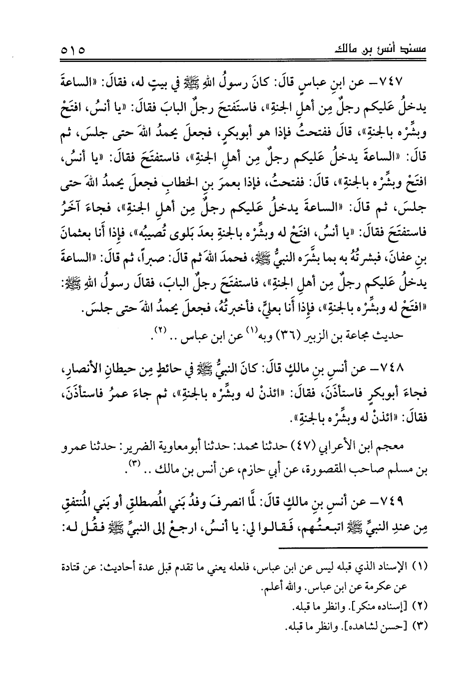 747 - عن ابنِ عباسٍ قالَ: كانَ رسولُ اللهِ صلى الله عليه وسلم في بيتٍ له، فقالَ: «الساعةَ يدخلُ عَليكم رجلٌ مِن أهلِ الجنةِ»، فاستَفتحَ رجلٌ البابَ فقالَ: «يا أنسُ، افتَحْ وبشِّرْه بالجنةِ»، قالَ ففتحتُ فإذا هو أبوبكرٍ، فجعلَ يحمدُ اللهَ حتى جلسَ، ثم قالَ: «الساعةَ يدخلُ عَليكم رجلٌ مِن أهلِ الجنةِ»، فاستفتَحَ فقالَ: «يا أنسُ، افتَحْ وبشِّرْه بالجنةِ»، قالَ: ففتحتُ، فإذا بعمرَ بنِ الخطابِ فجعلَ يحمدُ اللهَ حتى جلسَ، ثم قالَ: «الساعةَ يدخلُ عَليكم رجلٌ مِن أهلِ الجنةِ»، فجاءَ آخَرُ فاستفتَحَ فقالَ: «يا أنسُ، افتَحْ له وبشِّرْه بالجنةِ بعدَ بَلوى تُصيبُه»، فإِذا أَنا بعثمانَ بنِ عفانَ، فبشرتُهُ به بما بشَّرَه النبيُّ صلى الله عليه وسلم، فحمدَ اللهَ ثم قالَ: صبراً، ثم قالَ: «الساعةَ يدخلُ عَليكم رجلٌ مِن أهلِ الجنةِ»، فاستفتَحَ رجلٌ البابَ، فقالَ رسولُ اللهِ صلى الله عليه وسلم: «افتَحْ له وبشِّرْه بالجنةِ»، فإِذا أَنا بعليٍّ، فأخبرتُهُ، فجعلَ يحمدُ اللهَ حتى جلسَ.