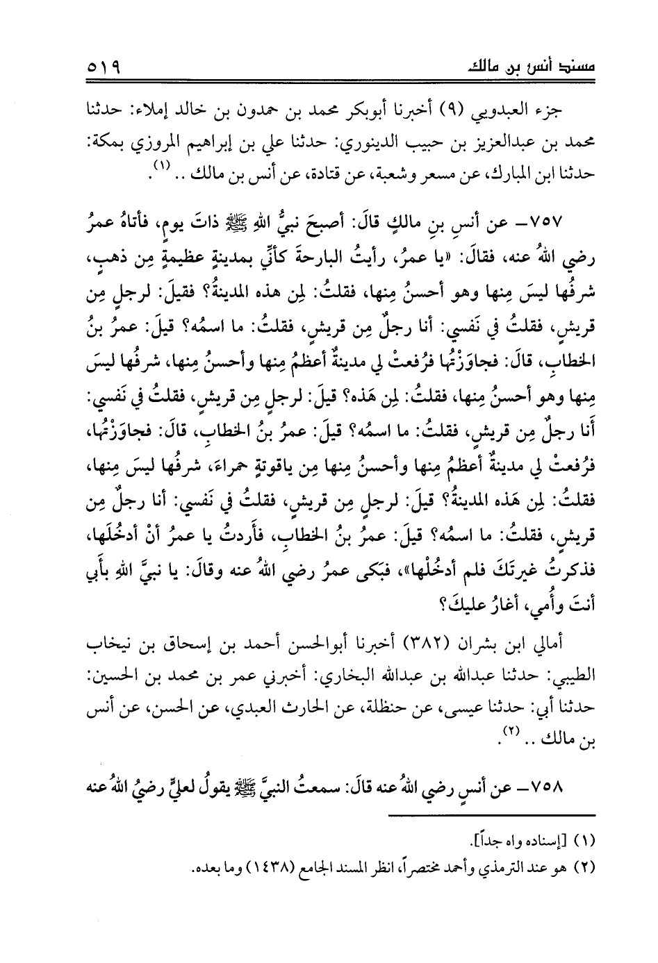 757 - عن أنسِ بنِ مالكٍ قالَ: أصبحَ نبيُّ اللهِ صلى الله عليه وسلم ذاتَ يومٍ، فأتاهُ عمرُ رضي اللهُ عنه، فقالَ: «يا عمرُ، رأيتُ البارحةَ كأنِّي بمدينةٍ عظيمةٍ مِن ذهبٍ، شرفُها ليسَ مِنها وهو أحسنُ مِنها، فقلتُ: لِمن هذه المدينةُ؟ فقيلَ: لرجلٍ مِن قريشٍ، فقلتُ في نَفسي: أنا رجلٌ مِن قريشٍ، فقلتُ: ما اسمُه؟ قيلَ: عمرُ بنُ الخطابِ، قالَ: فجاوَزْتُها فرُفعتْ لي مدينةٌ أعظمُ مِنها وأحسنُ مِنها، شرفُها ليسَ مِنها وهو أحسنُ مِنها، فقلتُ: لِمن هَذه؟ قيلَ: لرجلٍ مِن قريشٍ، فقلتُ في نَفسي: أَنا رجلٌ مِن قريشٍ، فقلتُ: ما اسمُه؟ قيلَ: عمرُ بنُ الخطابِ، قالَ: فجاوَزْتُها، فرُفعتْ لي مدينةٌ أعظمُ مِنها وأحسنُ مِنها مِن ياقوتةٍ حمراءَ، شرفُها ليسَ مِنها، فقلتُ: لِمن هَذه المدينةُ؟ قيلَ: لرجلٍ مِن قريشٍ، فقلتُ في نَفسي: أنا رجلٌ مِن قريشٍ، فقلتُ: ما اسمُه؟ قيلَ: عمرُ بنُ الخطابِ، فأَردتُ يا عمرُ أنْ أدخُلَها، فذكرتُ غيرتَكَ فلم أدخُلْها»، فبَكى عمرُ رضي اللهُ عنه وقالَ: يا نبيَّ اللهِ بأَبي أنتَ وأُمي، أغارُ عليكَ؟