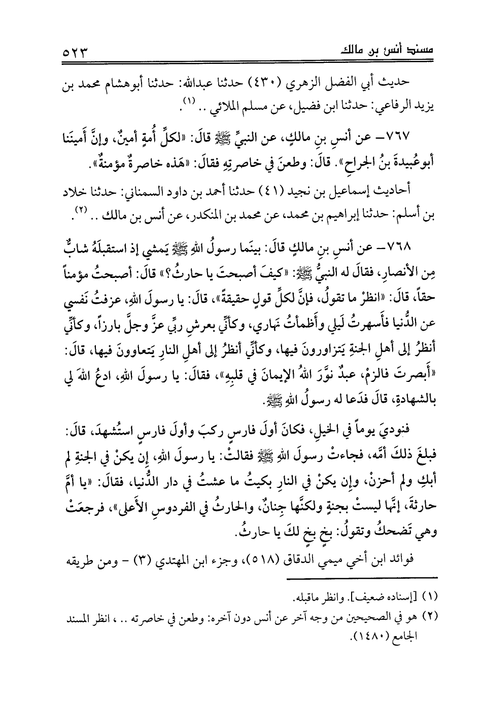 768 - عن أنسِ بنِ مالكٍ قالَ: بينَما رسولُ اللهِ صلى الله عليه وسلم يَمشي إذ استقبلَهُ شابٌّ مِن الأنصارِ، فقالَ له النبيُّ صلى الله عليه وسلم: «كيفَ أصبحتَ يا حارثُ؟» قالَ: أصبحتُ مؤمناً حقاً، قالَ: «انظرْ ما تقولُ، فإنَّ لكلِّ قولٍ حقيقةً»، قالَ: يا رسولَ اللهِ، عزفتُ نَفسي عن الدُّنيا فأَسهرتُ لَيلي وأَظمأتُ نَهاري، وكأنِّي بعرشِ ربِّي عزَّ وجلَّ بارزاً، وكأنِّي أنظرُ إلى أهلِ الجنةِ يَتزاورونَ فيها، وكأنِّي أنظرُ إلى أهلِ النارِ يَتعاوونَ فيها، قالَ: «أَبصرتَ فالزمْ، عبدٌ نوَّرَ اللهُ الإيمانَ في قلبِهِ»، فقالَ: يا رسولَ اللهِ، ادعُ اللهَ لي بالشهادةِ، قالَ فدَعا له رسولُ اللهِ صلى الله عليه وسلم.