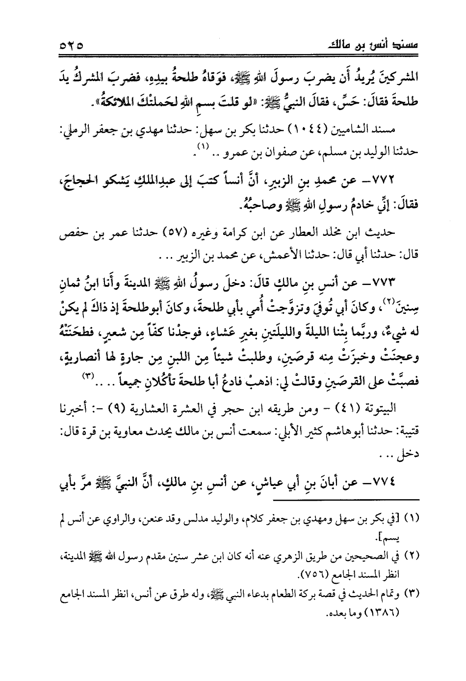 773 - عن أنسِ بنِ مالكٍ قالَ: دخلَ رسولُ اللهِ صلى الله عليه وسلم المدينةَ وأَنا ابنُ ثمانِ سِنينَ (¬2)، وكانَ أبي تُوفيَ وتزوَّجتْ أُمي بأبي طلحةَ، وكانَ أبوطلحةَ إذ ذاكَ لم يكنْ له شيءٌ، وربَّما بِتْنا الليلةَ والليلَتينِ بغيرِ عَشاءٍ، فوجدْنا كفّاً مِن شعيرٍ، فطحَنَتْهُ وعجنَتْ وخبزَتْ مِنه قرصَينِ، وطلبتْ شيئاً مِن اللبنِ مِن جارةٍ لها أنصاريةٍ، فصبَّتْ على القرصَينِ وقالتْ لي: اذهبْ فادعُ أبا طلحةَ تأكُلانِ جميعاً .. .. (¬3)