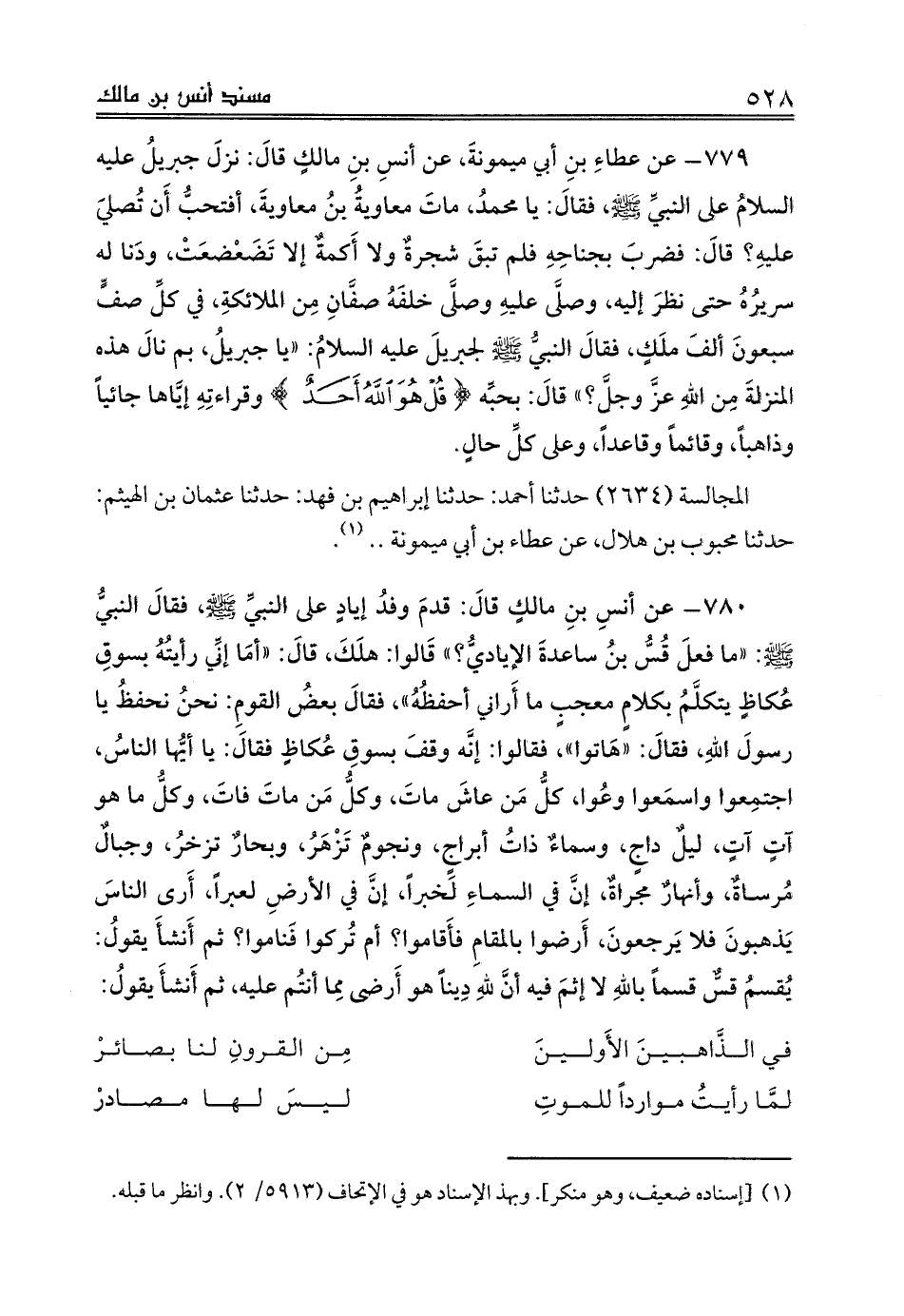 780 - عن أنسِ بنِ مالكٍ قالَ: قدمَ وفدُ إيادٍ على النبيِّ صلى الله عليه وسلم، فقالَ النبيُّ صلى الله عليه وسلم: «ما فعلَ قُسُّ بنُ ساعدةَ الإياديُّ؟» قَالوا: هلَكَ، قالَ: «أمَا إنِّي رأيتُهُ بسوقِ عُكاظٍ يتكلَّمُ بكلامٍ معجبٍ ما أَراني أحفظُهُ»، فقالَ بعضُ القومِ: نحنُ نحفظُ يا رسولَ اللهِ، فقالَ: «هَاتوا»، فقالوا: إنَّه وقفَ بسوقِ عُكاظٍ فقالَ: يا أيُّها الناسُ، اجتمِعوا واسمَعوا وعُوا، كلُّ مَن عاشَ ماتَ، وكلَّ مَن ماتَ فاتَ، وكلَّ ما هو آتٍ آتٍ، ليلٌ داجٍ، وسماءٌ ذاتُ أبراجٍ، ونجومٌ تَزْهَرُ، وبحارٌ تزخرُ، وجبالٌ مُرساةٌ، وأنهارٌ مجراةٌ، إنَّ في السماءِ لَخبراً، إنَّ في الأرضِ لعبراً، أَرى الناسَ يَذهبونَ فلا يَرجعونَ، أَرضوا بالمقامِ فأَقاموا؟ أم تُركوا فَناموا؟ ثم أَنشأَ يقولُ: يُقسمُ قسٌّ قسماً باللهِ لا إثمَ فيه أنَّ للهِ دِيناً هو أَرضى مِما أنتُم عليه، ثم أَنشأَ يقولُ: