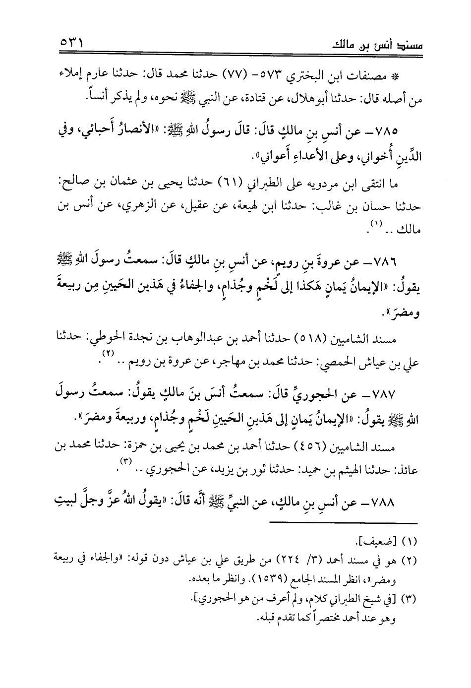 787 - عن الحجوريِّ قالَ: سمعتَ أنسَ بنَ مالكٍ يقولُ: سمعتُ رسولَ اللهِ صلى الله عليه وسلم يقولُ: «الإيمانُ يَمانٍ إلى هَذينِ الحَيينِ لَخْمٍ وجُذامٍ، وربيعةَ ومضرَ».