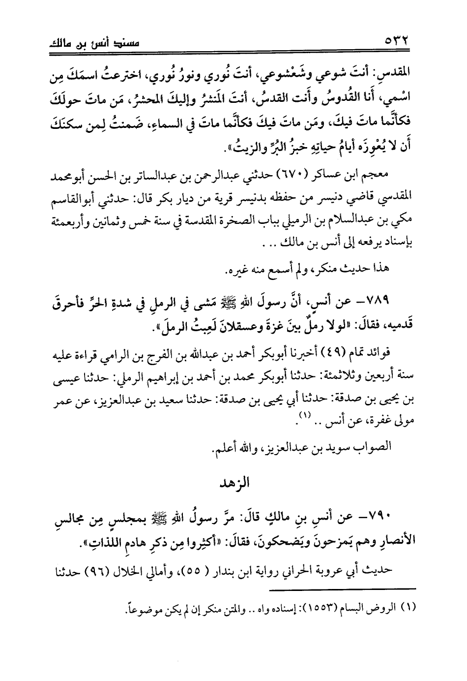 789 - عن أنسٍ، أنَّ رسولَ اللهِ صلى الله عليه وسلم مَشى في الرملِ في شدةِ الحرِّ فأحرقَ قَدميه، فقالَ: «لولا رملٌ بينَ غزةَ وعسقلانَ لَعِبتُ الرملَ».