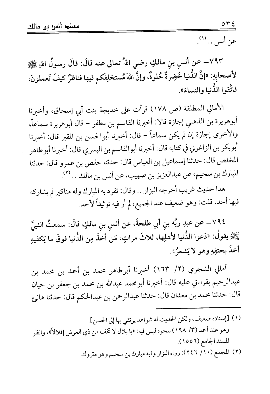 الأمالي المطلقة (ص 178) قرأت على خديجة بنت أبي إسحاق، وأخبرنا أبوهريرة بن الذهبي إجازة قالا: أخبرنا القاسم بن مظفر - قال أبوهريرة سماعاً، والأخرى إجازة إن لم يكن سماعاً - قال: أخبرنا أبوالحسن بن المقير قال: أخبرنا أبوبكر بن الزاغوني في كتابه قال: أخبرنا أبوالقاسم بن البسري قال: أخبرنا أبوطاهر المخلص قال: حدثنا إسماعيل بن العباس قال: حدثنا حفص بن عمرو قال: حدثنا المبارك بن سحيم، عن عبدالعزيز بن صهيب، عن أنس بن مالك .. (¬2).