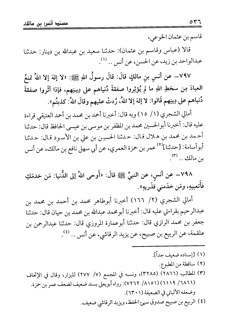 أمالي الشجري (1/ 15) وبه قال: أخبرنا أحمد بن محمد بن أحمد العتيقي قراءة عليه قال: أخبرنا أبوالحسين محمد بن المظفر بن موسى بن عيسى الحافظ قال: حدثنا أحمد بن محمد بن هلال قال: حدثنا الحسين بن علي بن الأسود قال: حدثنا أبوأسامة: [حدثنا] (¬2) عمر بن حمزة العمري، عن أبي سهل نافع بن مالك، عن أنس بن مالك .. (¬3).