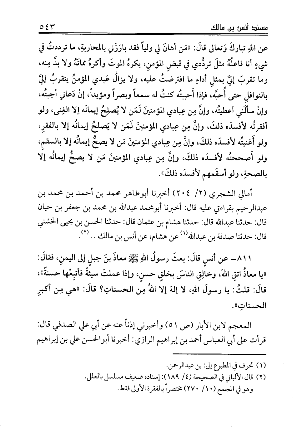 أمالي الشجري (2/ 204) أخبرنا أبوطاهر محمد بن أحمد بن محمد بن عبدالرحيم بقراءتي عليه قال: أخبرنا أبومحمد عبدالله بن محمد بن جعفر بن حيان قال: حدثنا عبدالله قال: حدثنا هشام بن عثمان قال: حدثنا الحسن بن يحيى الخشني قال: حدثنا صدقة بن عبدالله (¬1) عن هشام، عن أنس بن مالك .. (¬2).