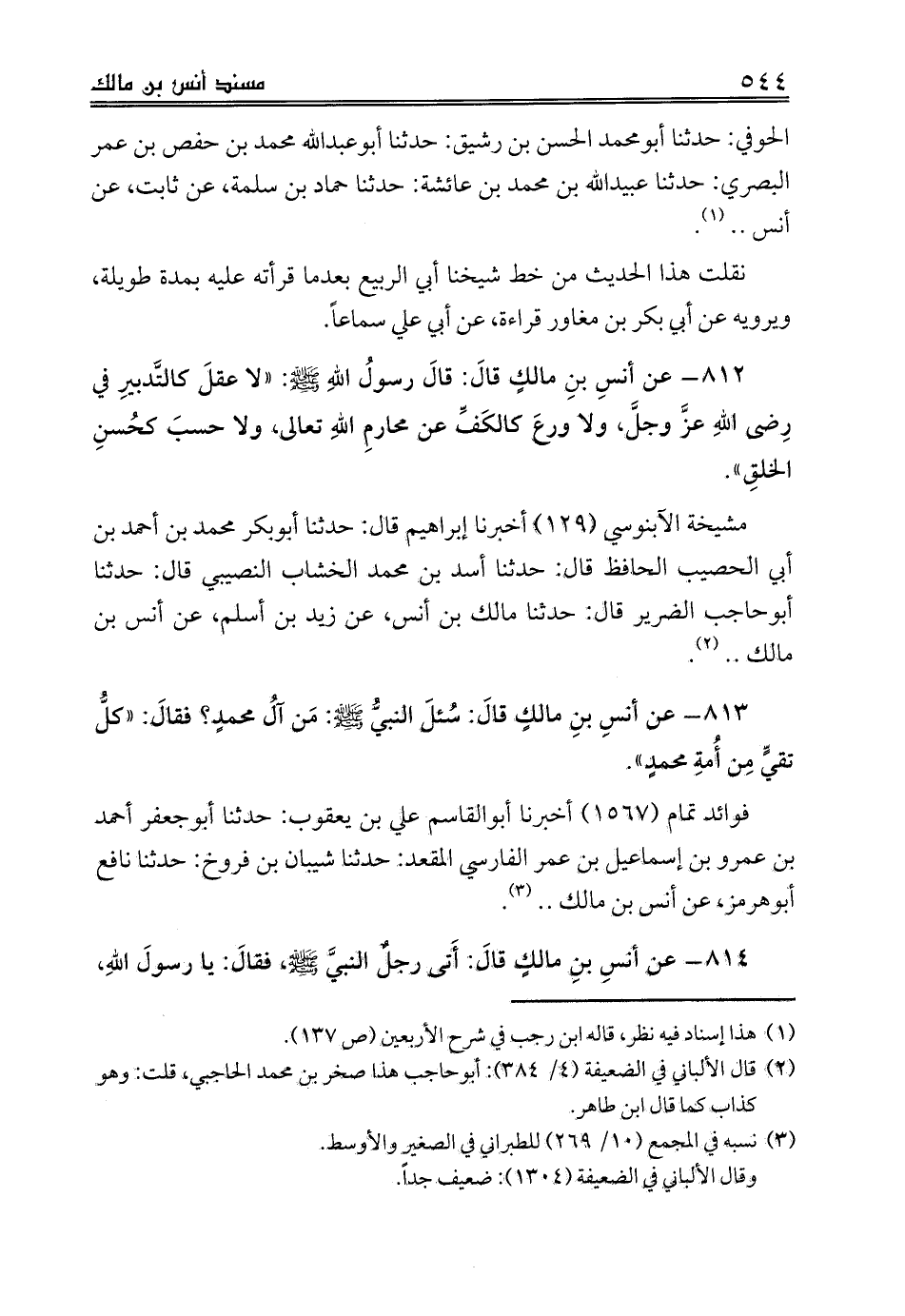 812 - عن أنسِ بنِ مالكٍ قالَ: قالَ رسولُ اللهِ صلى الله عليه وسلم: «لا عقلَ كالتَّدبيرِ في رِضى اللهِ عزَّ وجلَّ، ولا ورعَ كالكَفِّ عن محارمِ اللهِ تعالى، ولا حسبَ كحُسنِ الخلقِ».