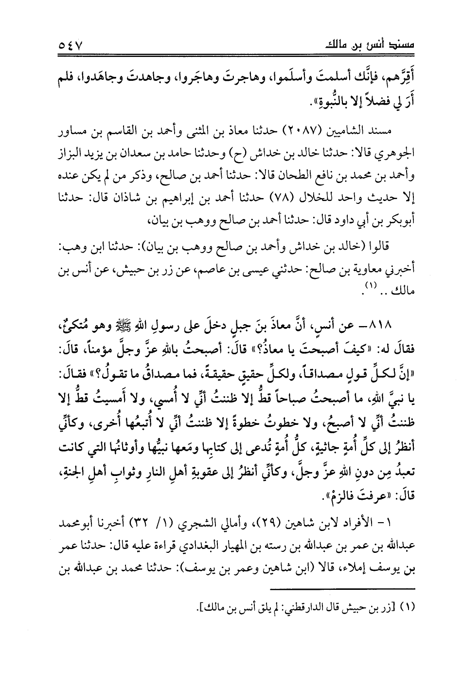 قالوا (خالد بن خداش وأحمد بن صالح ووهب بن بيان): حدثنا ابن وهب: أخبرني معاوية بن صالح: حدثني عيسى بن عاصم، عن زر بن حبيش، عن أنس بن مالك .. (¬1).
