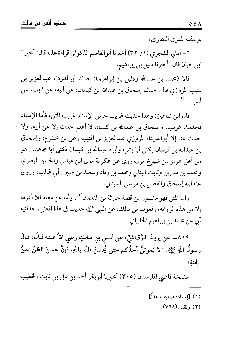 819 - عن يزيدَ الرَّقاشيِّ، عن أنسِ بنِ مالكٍ رضي اللهُ عنه قالَ: قالَ رسولُ اللهِ صلى الله عليه وسلم: «لا يَموتنَّ أحدُكم حتى يُحسنَ ظنَّه باللهِ، فإنَّ حسنَ الظنِّ ثمنُ الجنةِ».