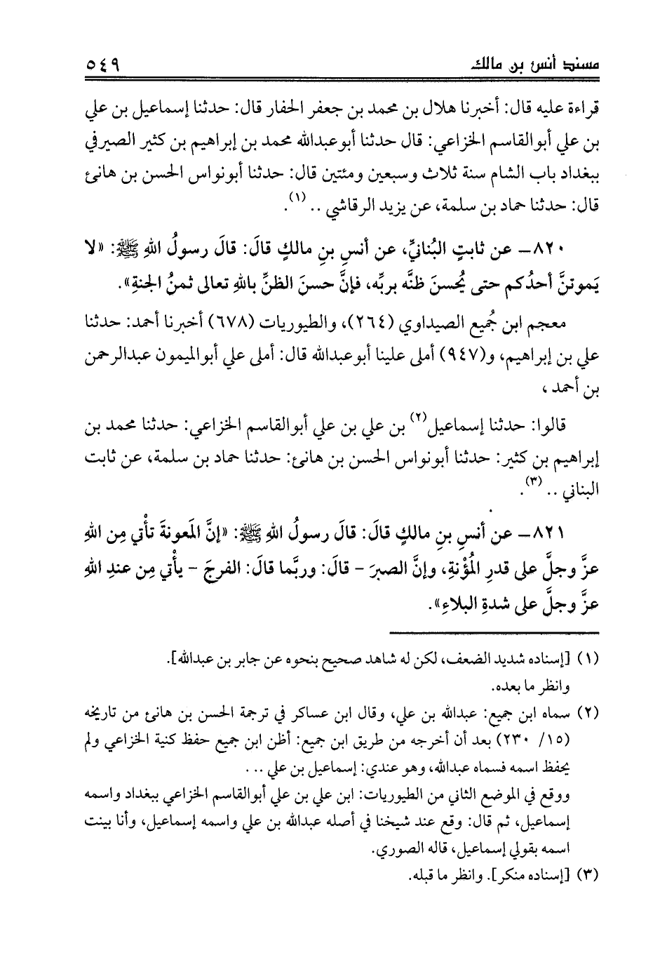 820 - عن ثابتٍ البُنانيِّ، عن أنسِ بنِ مالكٍ قالَ: قالَ رسولُ اللهِ صلى الله عليه وسلم: «لا يَموتنَّ أحدُكم حتى يُحسنَ ظنَّه بربِّه، فإنَّ حسنَ الظنِّ باللهِ تعالى ثمنُ الجنةِ».