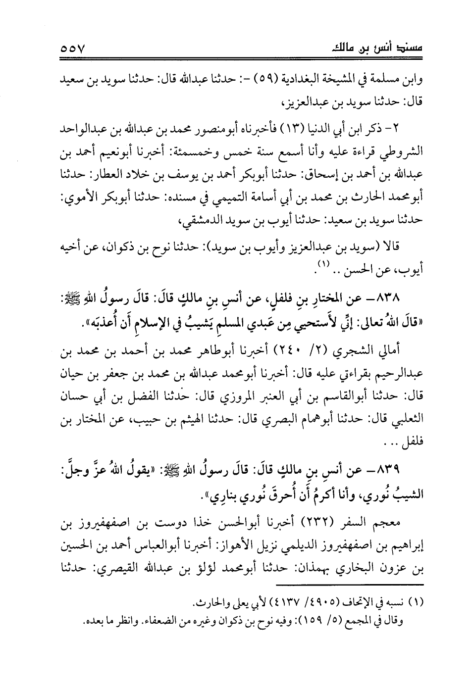 838 - عن المختارِ بنِ فلفلٍ، عن أنسِ بنِ مالكٍ قالَ: قالَ رسولُ اللهِ صلى الله عليه وسلم: «قالَ اللهُ تعالى: إنِّي لأَستحيي مِن عَبدي المسلمِ يَشيبُ في الإسلامِ أَن أُعذبَه».
