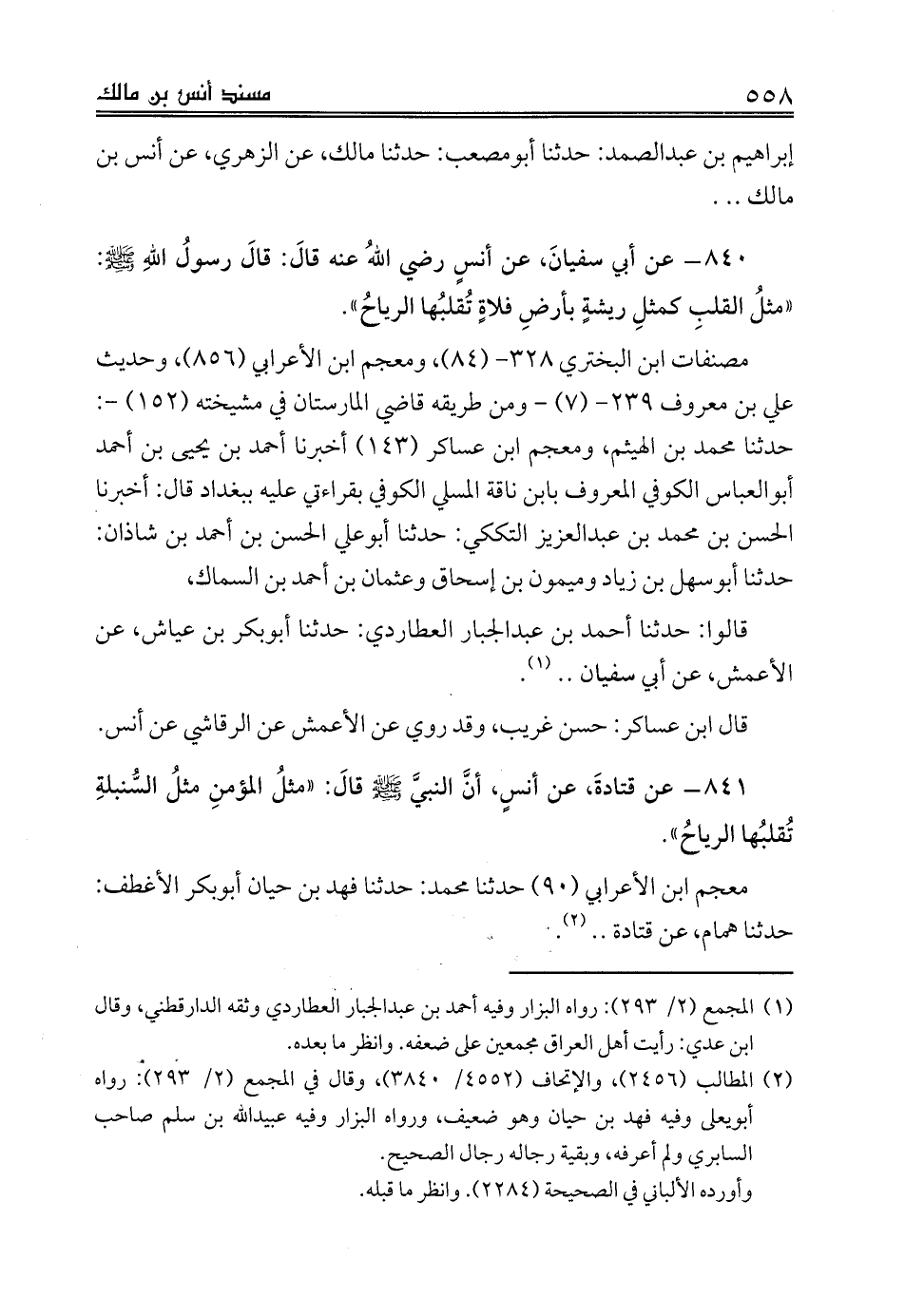 840 - عن أبي سفيانَ، عن أنسٍ رضي اللهُ عنه قالَ: قالَ رسولُ اللهِ صلى الله عليه وسلم: «مثلُ القلبِ كمثلِ ريشةٍ بأرضِ فلاةٍ تُقلبُها الرياحُ».