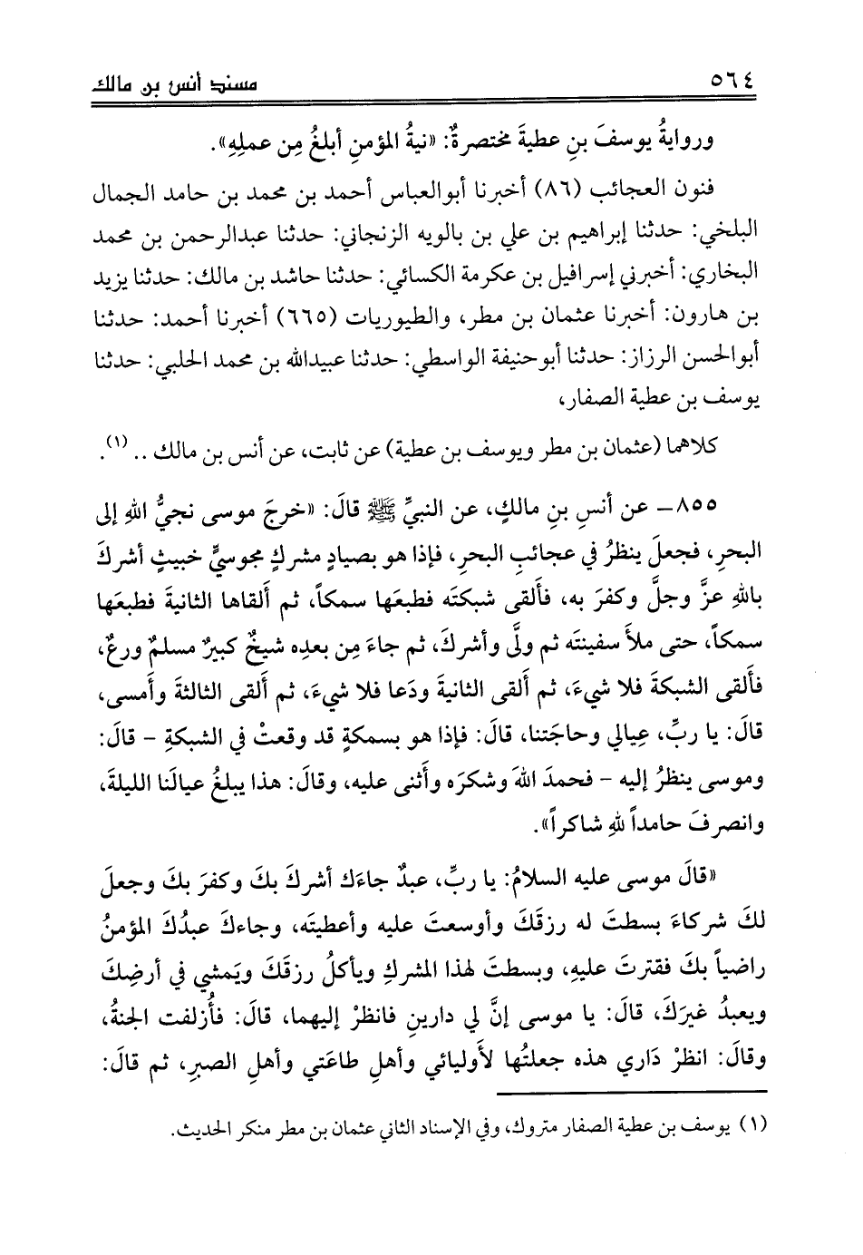 855 - عن أنسِ بنِ مالكٍ، عن النبيِّ صلى الله عليه وسلم قالَ: «خرجَ موسى نجيُّ اللهِ إلى البحرِ، فجعلَ ينظرُ في عجائبِ البحرِ، فإذا هو بصيادٍ مشركٍ مجوسيٍّ خبيثٍ أشركَ باللهِ عزَّ وجلَّ وكفرَ به، فأَلقى شبكتَه فطبعَها سمكاً، ثم أَلقاها الثانيةَ فطبعَها سمكاً، حتى ملأَ سفينتَه ثم ولَّى وأشركَ، ثم جاءَ مِن بعدِه شيخٌ كبيرٌ مسلمٌ ورعٌ، فأَلقى الشبكةَ فلا شيءَ، ثم أَلقى الثانيةَ ودَعا فلا شيءَ، ثم أَلقى الثالثةَ وأَمسى، قالَ: يا ربِّ، عِيالي وحاجَتنا، قالَ: فإذا هو بسمكةٍ قد وقعتْ في الشبكةِ - قالَ: وموسى ينظرُ إليه - فحمدَ اللهَ وشكرَه وأَثنى عليه، وقالَ: هذا يبلغُ عيالَنا الليلةَ، وانصرفَ حامداً للهِ شاكراً».