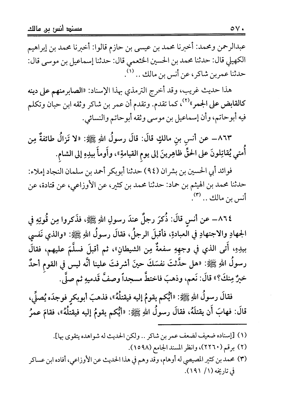 عبدالرحمن ومحمد: أخبرنا محمد بن عيسى بن حازم قالوا: أخبرنا محمد بن إبراهيم الكهيلي قال: حدثنا محمد بن الحسين الخثعمي قال: حدثنا إسماعيل بن موسى قال: حدثنا عمربن شاكر، عن أنس بن مالك .. (¬1).
