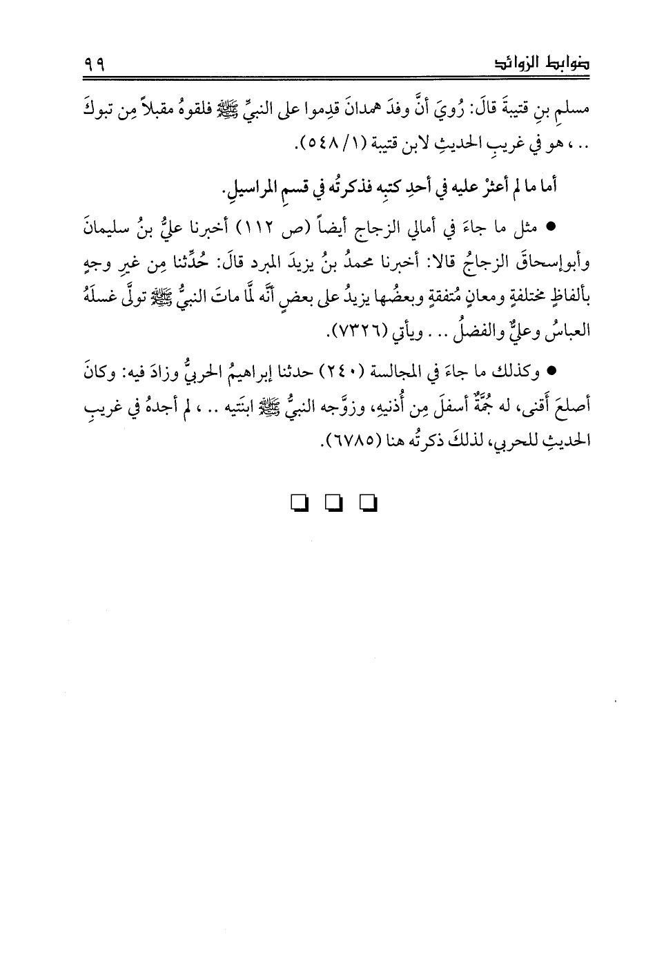 * وكذلك ما جاءَ في المجالسة (240) حدثنا إبراهيمُ الحربيُّ وزادَ فيه: وكانَ أصلعَ أَقنى، له جُمَّةٌ أسفلَ مِن أُذنيهِ، وزوَّجه النبيُّ - صلى الله عليه وسلم - ابنَتيه .. ، لم أجدهُ في غريبِ الحديثِ للحربي، لذلكَ ذكرتُه هنا (6785).