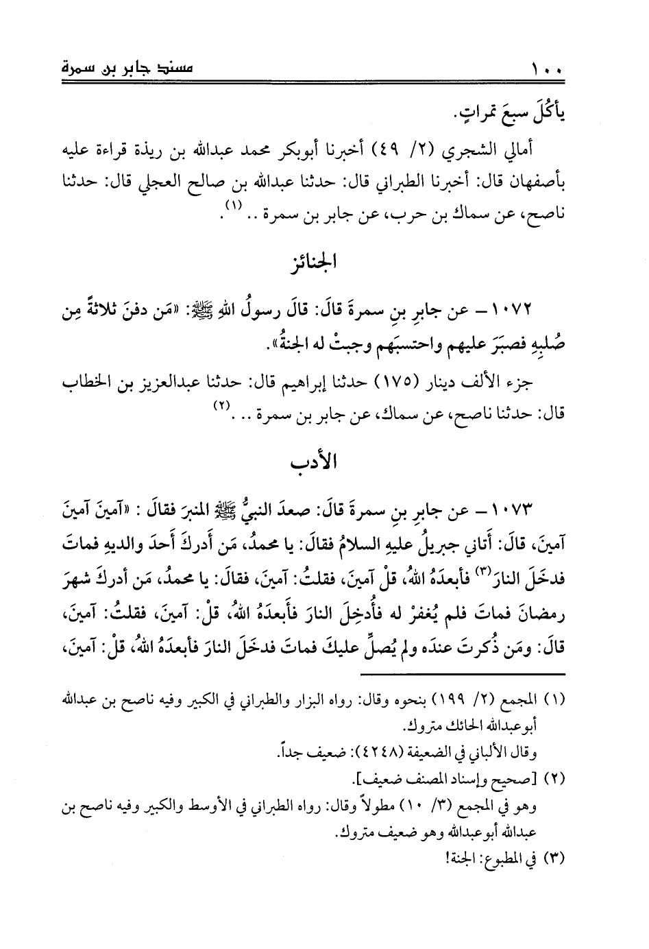 1072 - عن جابرِ بنِ سمرةَ قالَ: قالَ رسولُ اللهِ صلى الله عليه وسلم: «مَن دفنَ ثلاثةً مِن صُلبِهِ فصبَرَ عليهم واحتسبَهم وجبتْ له الجنةُ».