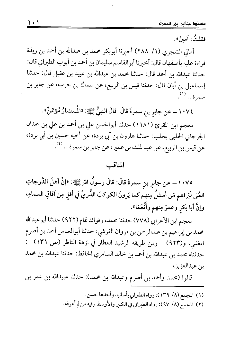 أمالي الشجري (1/ 288) أخبرنا أبوبكر محمد بن عبدالله بن أحمد بن ريذة قراءة عليه بأصفهان قال: أخبرنا أبوالقاسم سليمان بن أحمد بن أيوب الطبراني قال: حدثنا عبدالله بن أحمد قال: حدثنا محمد بن عبدالله بن عبيد بن عقيل قال: حدثنا إسماعيل بن أبان قال: حدثنا قيس بن الربيع، عن سماك بن حرب، عن جابر بن سمرة .. (¬1).