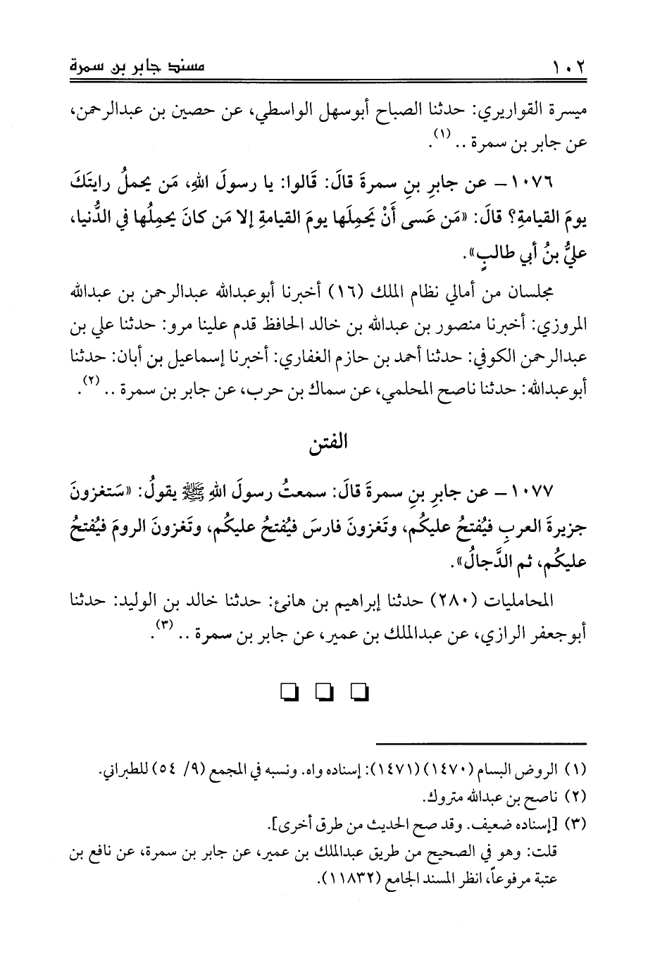 مجلسان من أمالي نظام الملك (16) أخبرنا أبوعبدالله عبدالرحمن بن عبدالله المروزي: أخبرنا منصور بن عبدالله بن خالد الحافظ قدم علينا مرو: حدثنا علي بن عبدالرحمن الكوفي: حدثنا أحمد بن حازم الغفاري: أخبرنا إسماعيل بن أبان: حدثنا أبوعبدالله: حدثنا ناصح المحلمي، عن سماك بن حرب، عن جابر بن سمرة .. (¬2).