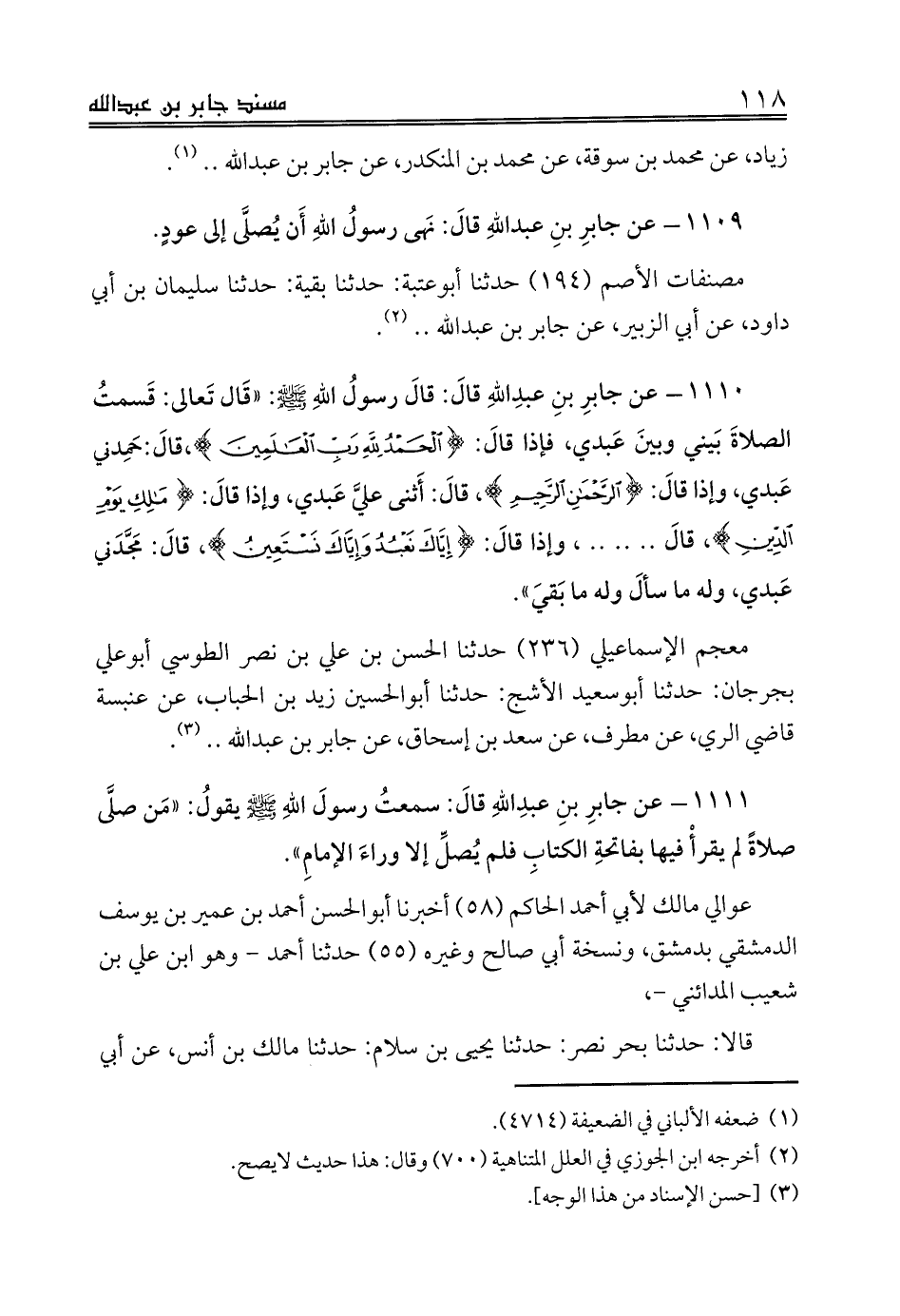 1110 - عن جابرِ بنِ عبدِاللهِ قالَ: قالَ رسولُ اللهِ صلى الله عليه وسلم: «قَال تَعالى: قَسمتُ الصلاةَ بَيني وبينَ عَبدي، فإذا قالَ: {الْحَمْدُ لِلَّهِ رَبِّ الْعَالَمِينَ}،قالَ: حَمِدني عَبدي، وإذا قالَ: {الرَّحْمَنِ الرَّحِيمِ}، قالَ: أَثنى عليَّ عَبدي، وإذا قالَ: {مَالِكِ يَوْمِ الدِّينِ}، قالَ .. .. .. ، وإذا قالَ: {إِيَّاكَ نَعْبُدُ وَإِيَّاكَ نَسْتَعِينُ}، قالَ: مَجَّدَني عَبدي، وله ما سألَ وله ما بَقيَ».