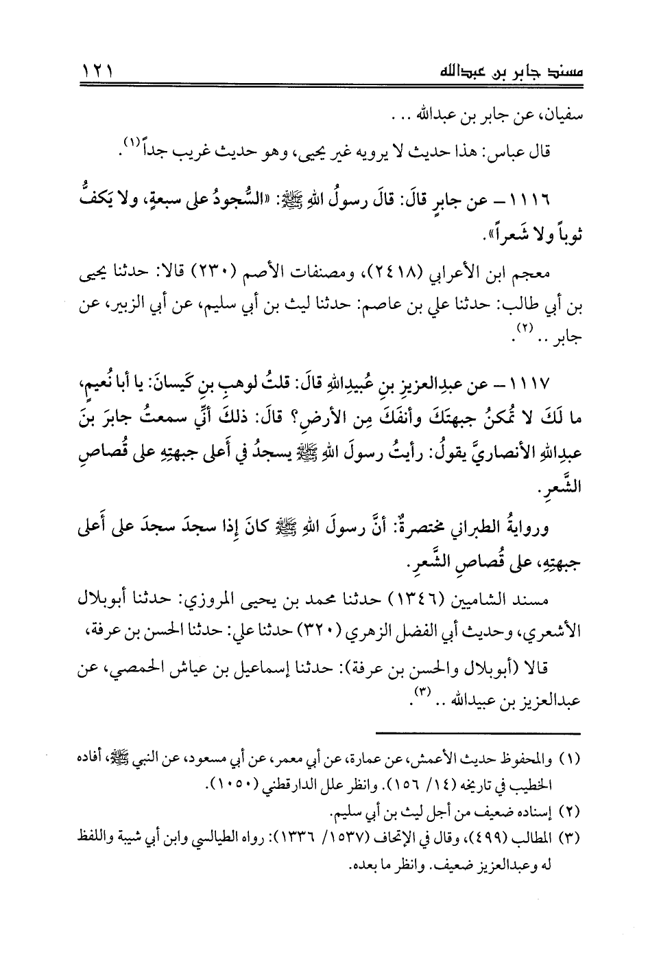 1116 - عن جابرٍ قالَ: قالَ رسولُ اللهِ صلى الله عليه وسلم: «السُّجودُ على سبعةٍ، ولا يَكفُّ ثوباً ولا شَعراً».