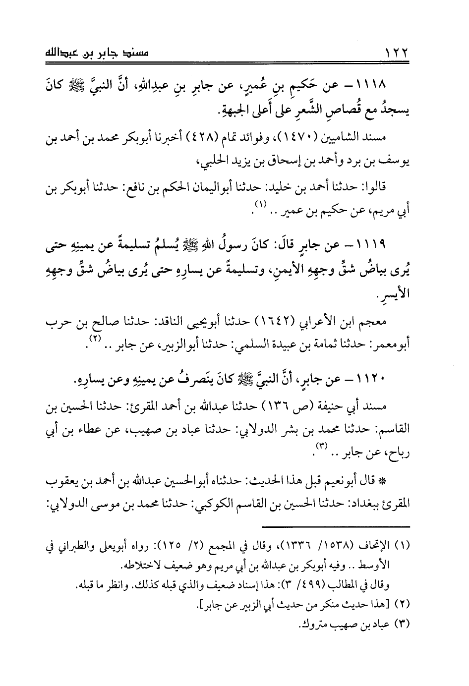 1118 - عن حَكيمِ بنِ عُميرٍ، عن جابرِ بنِ عبدِاللهِ، أنَّ النبيَّ صلى الله عليه وسلم كانَ يسجدُ مع قُصاصِ الشَّعرِ على أَعلى الجبهةِ.