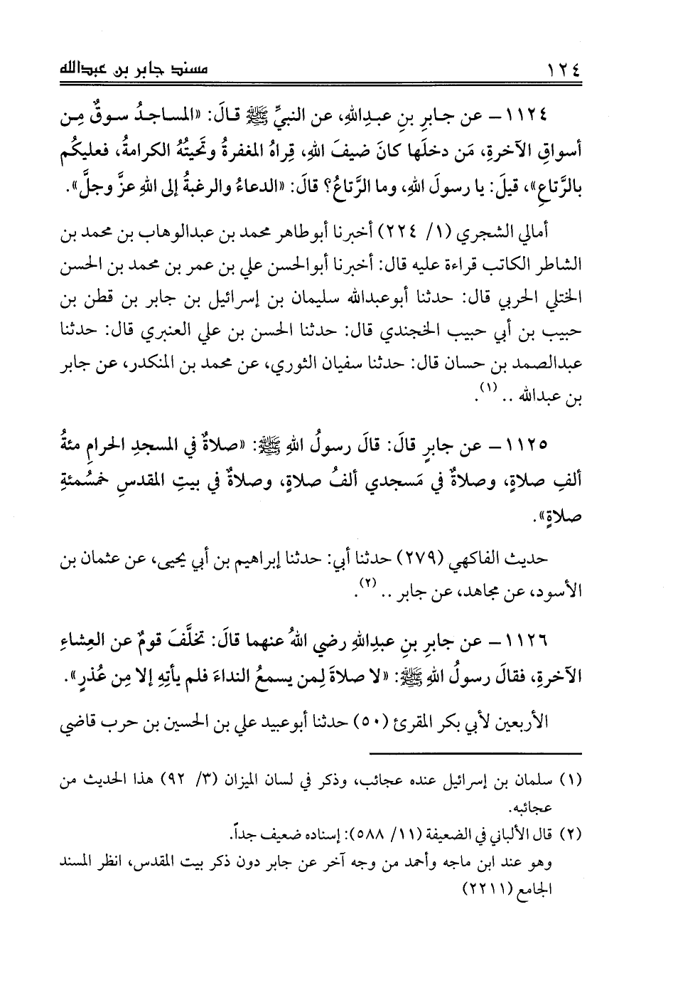 1124 - عن جابرِ بنِ عبدِاللهِ، عن النبيِّ صلى الله عليه وسلم قالَ: «المساجدُ سوقٌ مِن أسواقِ الآخرةِ، مَن دخلَها كانَ ضيفَ اللهِ، قِراهُ المغفرةُ وتَحيتُهُ الكرامةُ، فعليكُم بالرَّتاعِ»، قيلَ: يا رسولَ اللهِ، وما الرَّتاعُ؟ قالَ: «الدعاءُ والرغبةُ إلى اللهِ عزَّ وجلَّ».
