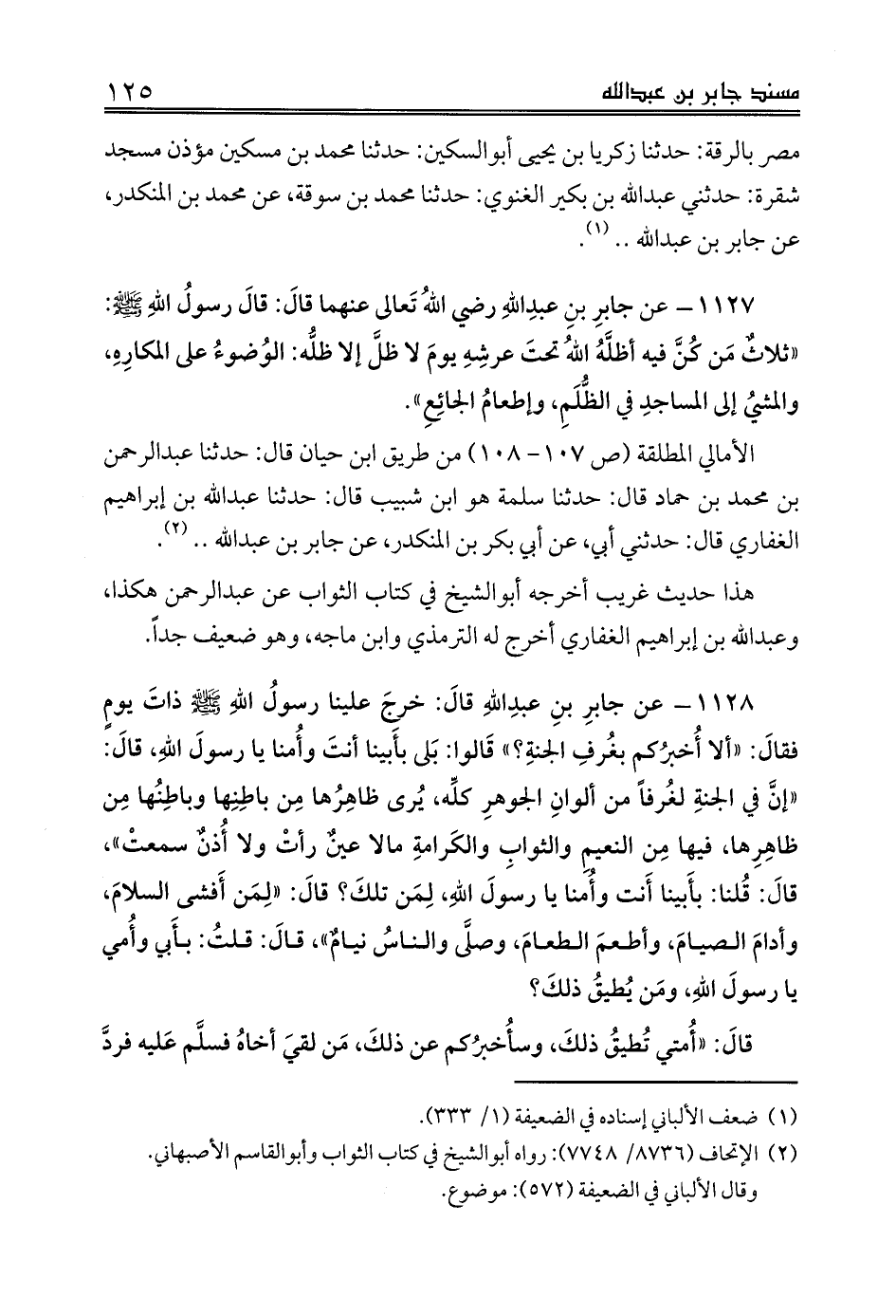1127 - عن جابرِ بنِ عبدِاللهِ رضي اللهُ تَعالى عنهما قالَ: قالَ رسولُ اللهِ صلى الله عليه وسلم: «ثلاثٌ مَن كُنَّ فيه أظلَّهُ اللهُ تحتَ عرشِهِ يومَ لا ظلَّ إلا ظلُّه: الوُضوءُ على المكارِهِ، والمشيُ إلى المساجدِ في الظُّلَمِ، وإطعامُ الجائِعِ».
