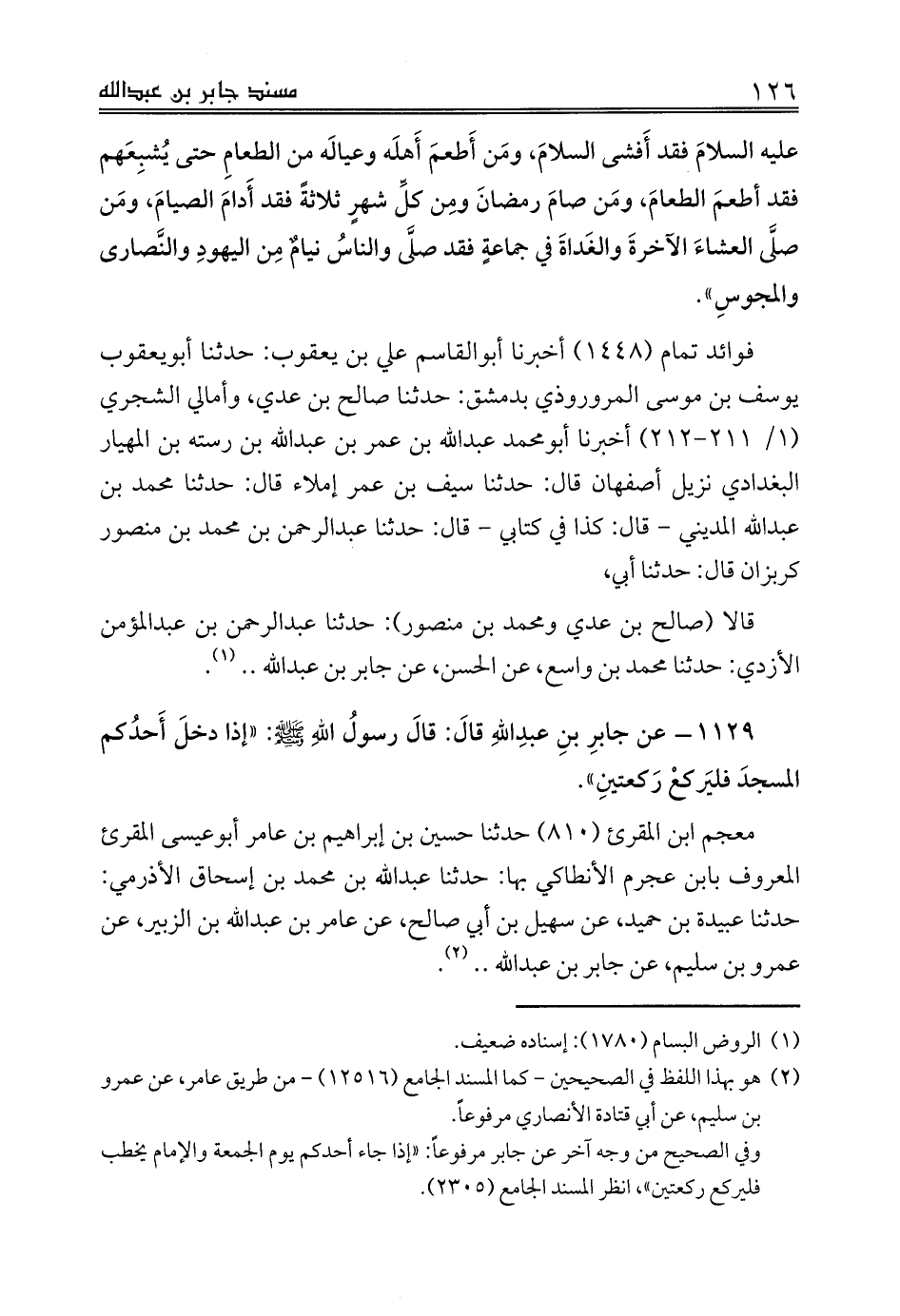 1129 - عن جابرِ بنِ عبدِاللهِ قالَ: قالَ رسولُ اللهِ صلى الله عليه وسلم: «إذا دخلَ أَحدُكم المسجدَ فليَركعْ رَكعتينِ».