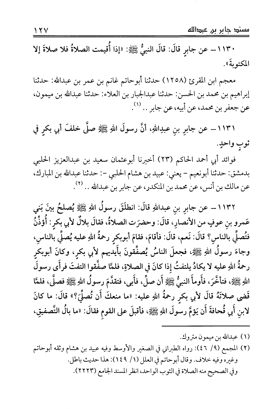 1131 - عن جابرِ بنِ عبدِاللهِ، أنَّ رسولَ اللهِ صلى الله عليه وسلم صلَّى خلفَ أبي بكرٍ في ثوبٍ واحدٍ.