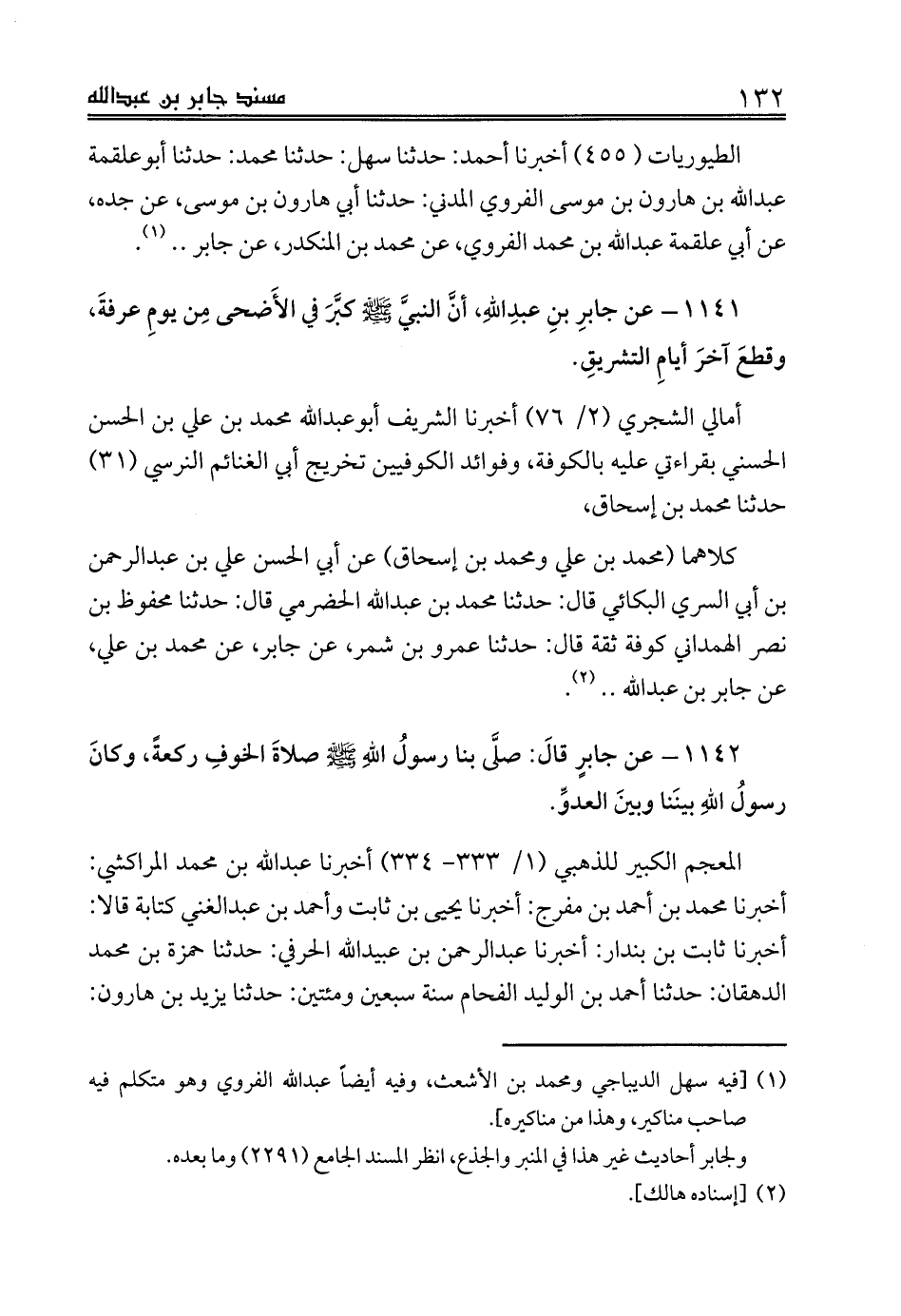 الطيوريات (455) أخبرنا أحمد: حدثنا سهل: حدثنا محمد: حدثنا أبوعلقمة عبدالله بن هارون بن موسى الفروي المدني: حدثنا أبي هارون بن موسى، عن جده، عن أبي علقمة عبدالله بن محمد الفروي، عن محمد بن المنكدر، عن جابر .. (¬1).