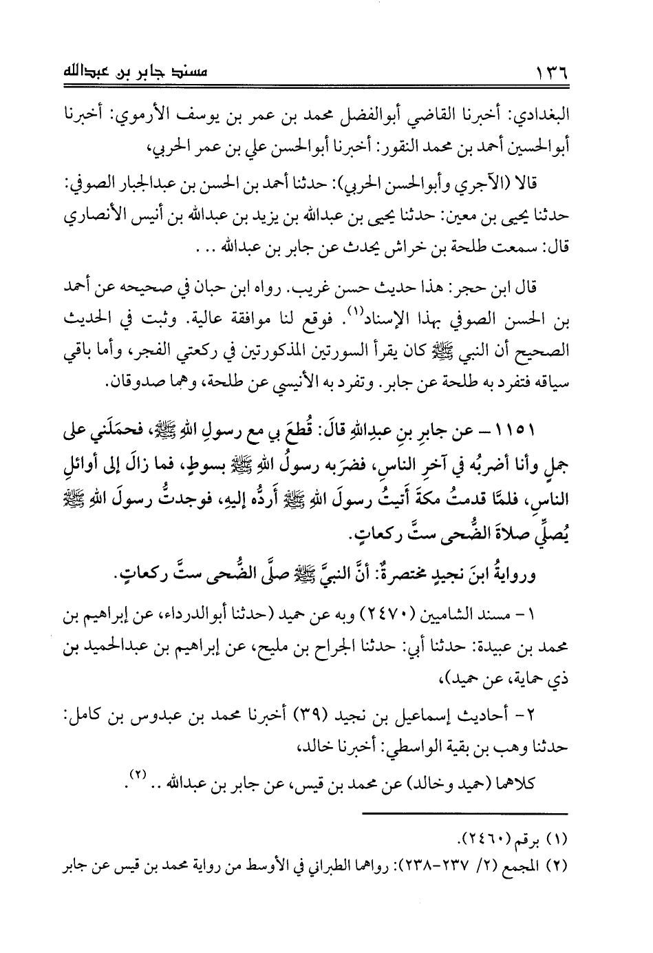 1151 - عن جابرِ بنِ عبدِاللهِ قالَ: قُطعَ بي مع رسولِ اللهِ صلى الله عليه وسلم، فحمَلَني على جملٍ وأنا أضربُه في آخرِ الناسِ، فضرَبه رسولُ اللهِ صلى الله عليه وسلم بسوطٍ، فما زالَ إلى أوائلِ الناسِ، فلمَّا قدمتُ مكةَ أَتيتُ رسولَ اللهِ صلى الله عليه وسلم أَردُّه إليهِ، فوجدتُّ رسولَ اللهِ صلى الله عليه وسلم يُصلِّي صلاةَ الضُّحى ستَّ ركعاتٍ.