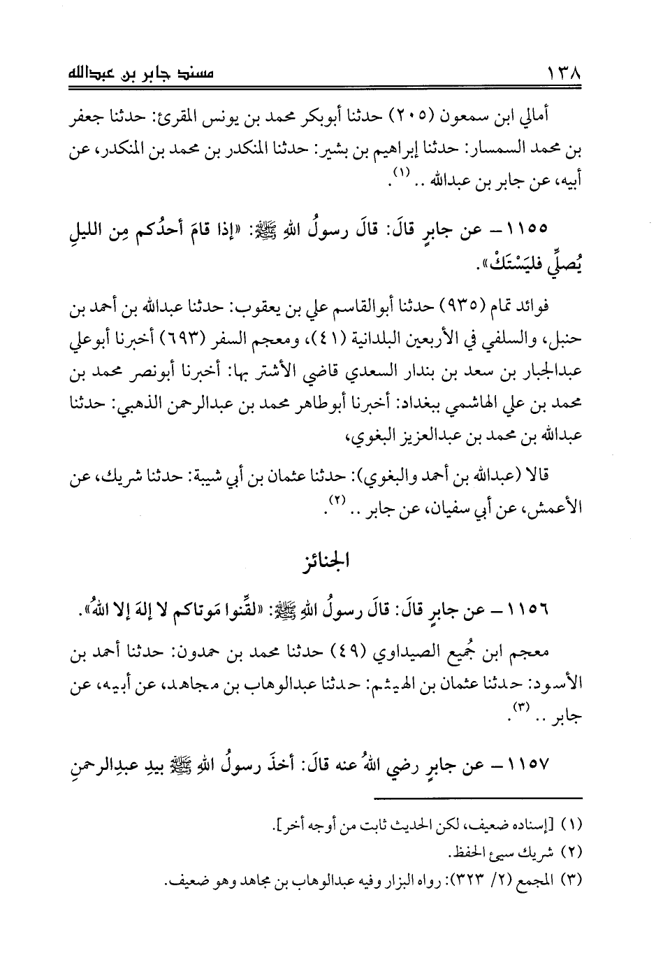 معجم ابن جُميع الصيداوي (49) حدثنا محمد بن حمدون: حدثنا أحمد بن الأسود: حدثنا عثمان بن الهيثم: حدثنا عبدالوهاب بن مجاهد، عن أبيه، عن جابر .. (¬3).