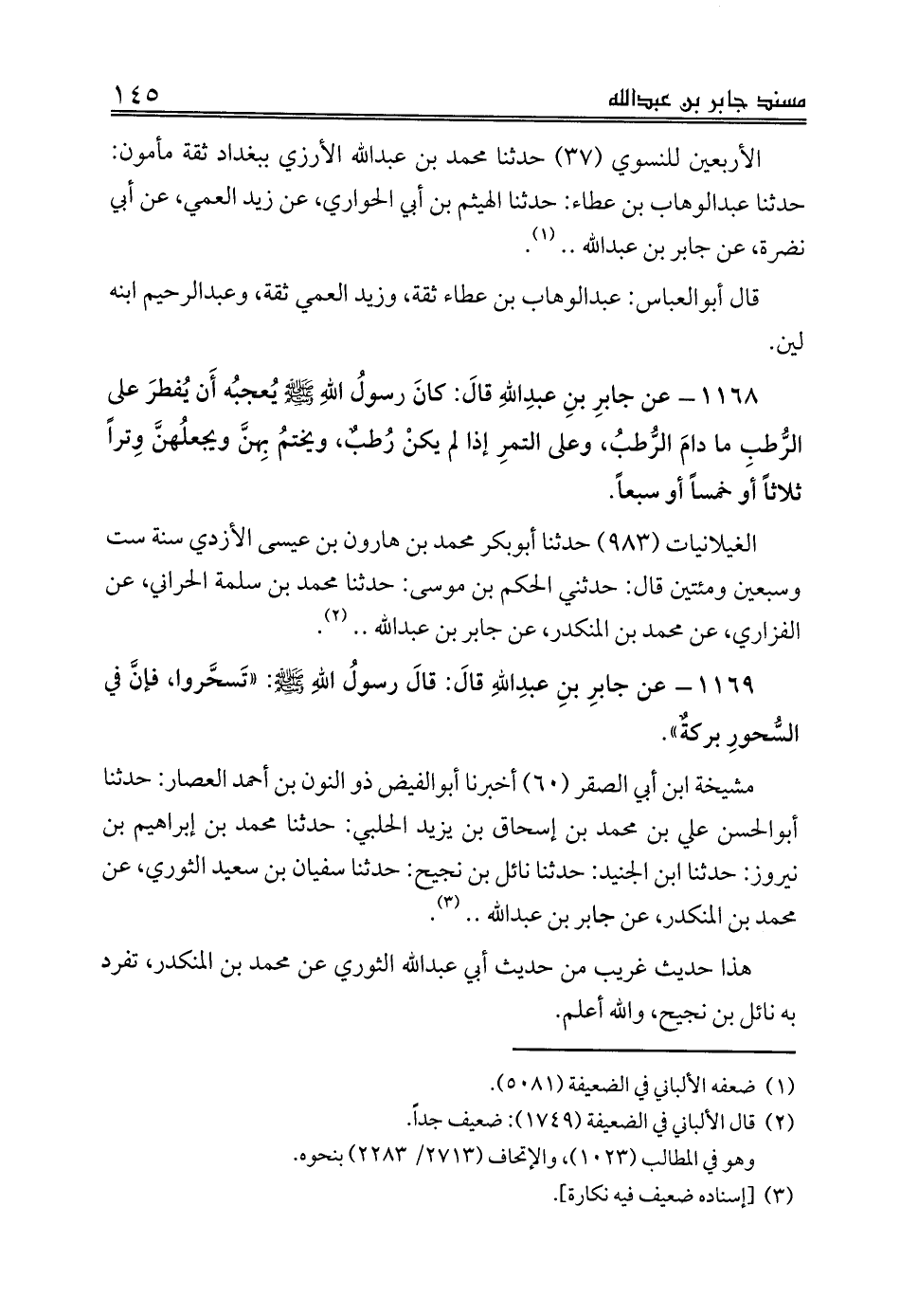 1169 - عن جابرِ بنِ عبدِاللهِ قالَ: قالَ رسولُ اللهِ صلى الله عليه وسلم: «تَسحَّروا، فإنَّ في السُّحورِ بركةٌ».