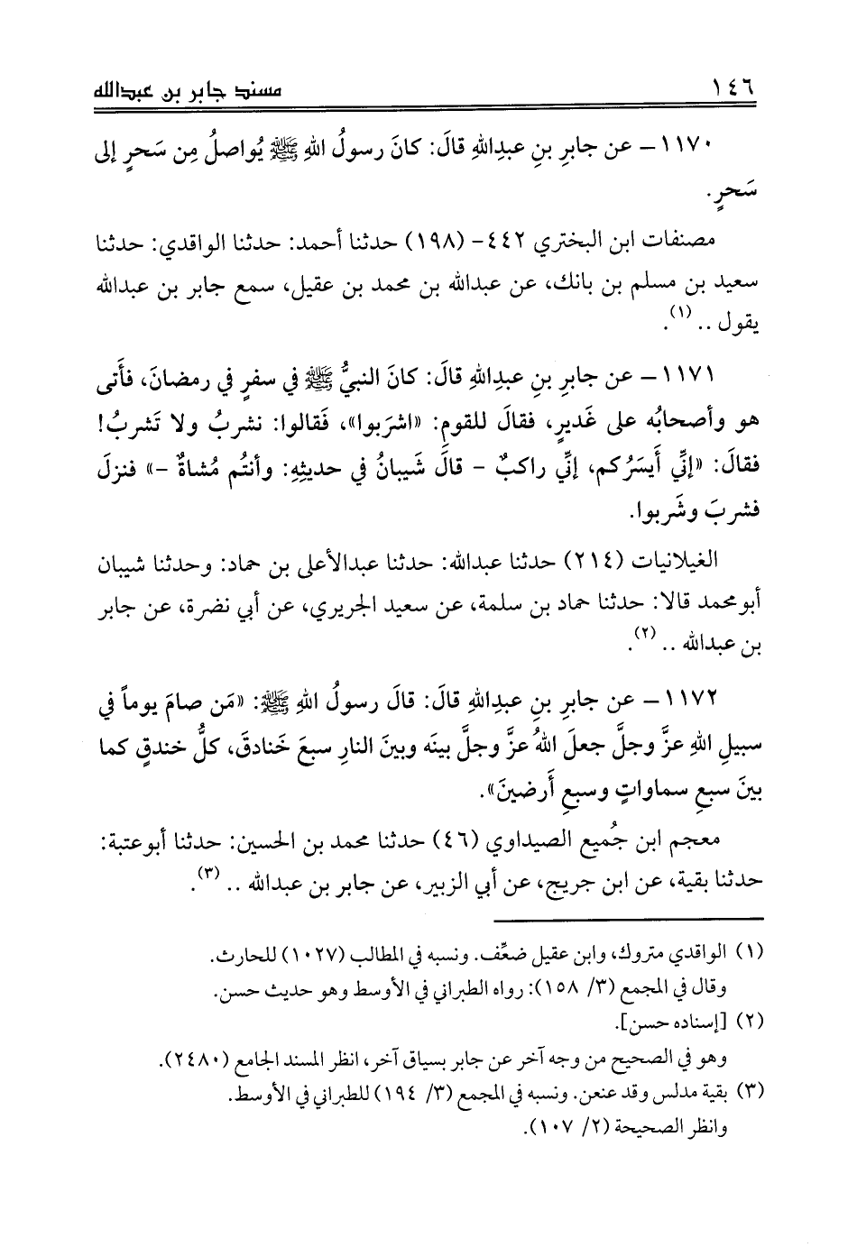 مصنفات ابن البختري 442 - (198) حدثنا أحمد: حدثنا الواقدي: حدثنا سعيد بن مسلم بن بانك، عن عبدالله بن محمد بن عقيل، سمع جابر بن عبدالله يقول .. (¬1).