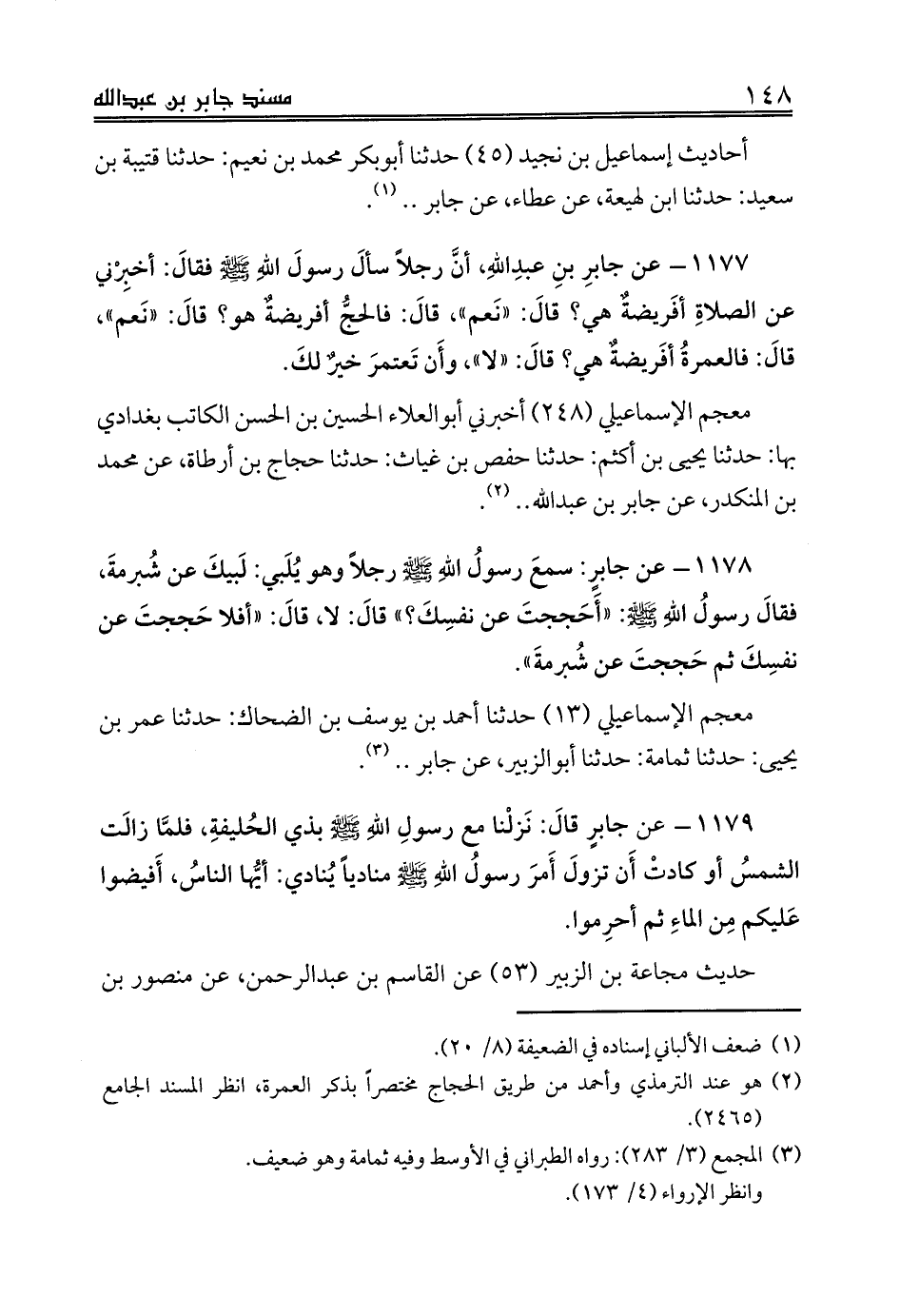 1178 - عن جابرٍ: سمعَ رسولُ اللهِ صلى الله عليه وسلم رجلاً وهو يُلَبي: لَبيكَ عن شُبرمةَ، فقالَ رسولُ اللهِ صلى الله عليه وسلم: «أَحَججتَ عن نفسِكَ؟» قالَ: لا، قالَ: «أفلا حَججتَ عن نفسِكَ ثم حَججتَ عن شُبرمةَ».