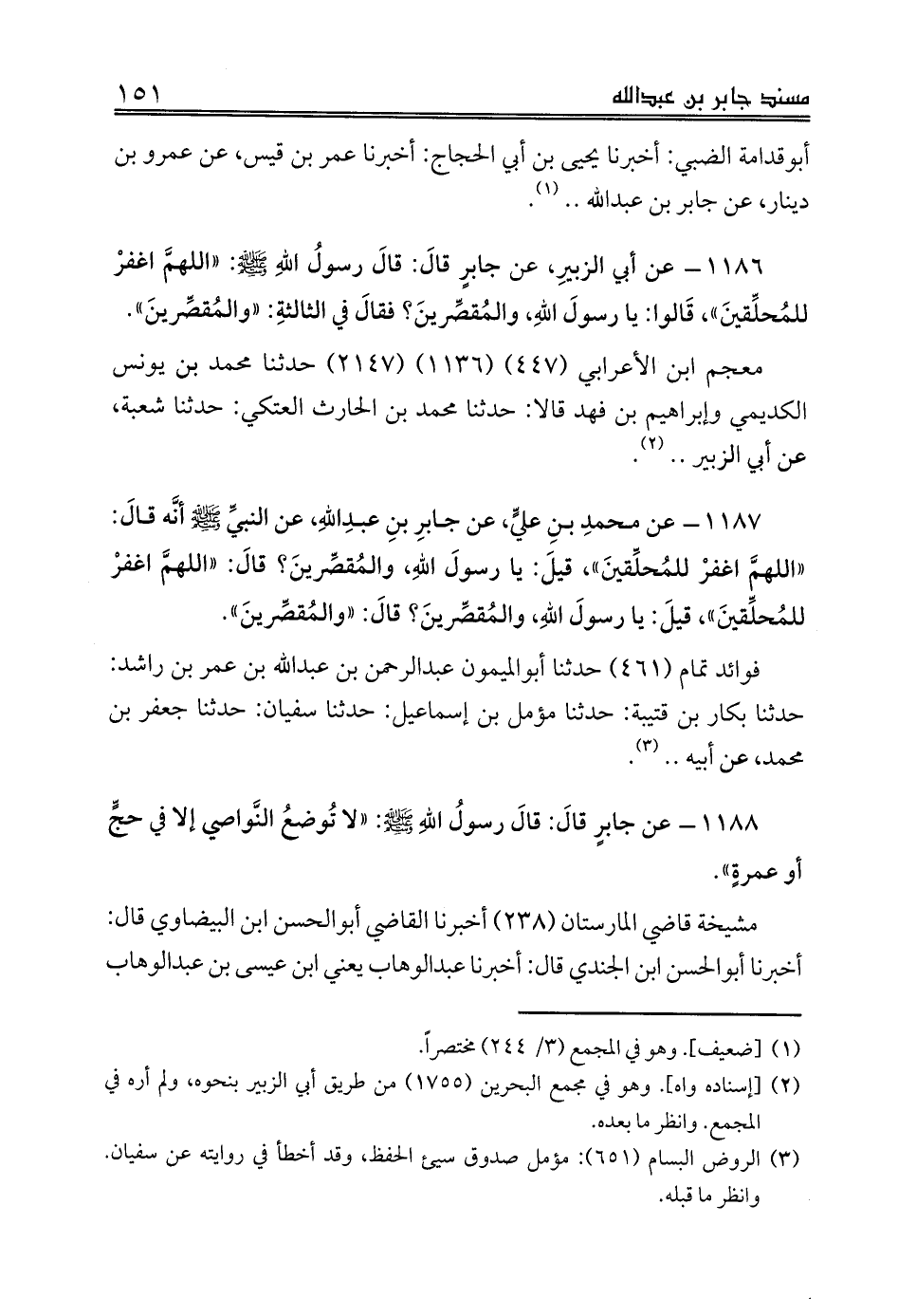 1186 - عن أبي الزبيرِ، عن جابرٍ قالَ: قالَ رسولُ اللهِ صلى الله عليه وسلم: «اللهمَّ اغفرْ للمُحلِّقينَ»، قَالوا: يا رسولَ اللهِ، والمُقصِّرينَ؟ فقالَ في الثالثةِ: «والمُقصِّرينَ».