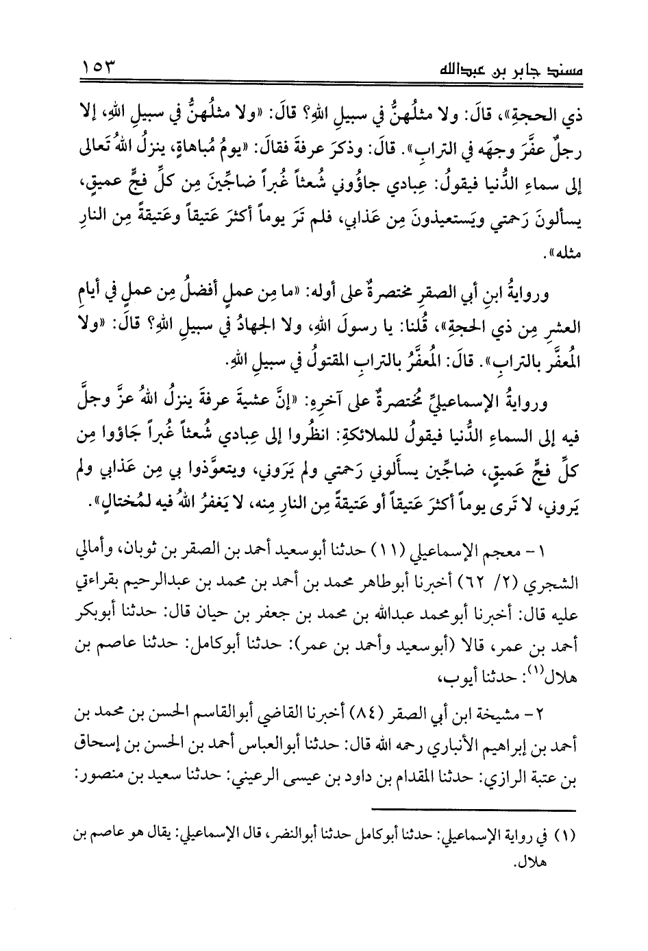 وروايةُ الإسماعيليِّ مُختصرةٌ على آخرِهِ: «إنَّ عشيةَ عرفةَ ينزلُ اللهُ عزَّ وجلَّ فيه إلى السماءِ الدُّنيا فيقولُ للملائكةِ: انظُروا إلى عِبادي شُعثاً غُبراً جَاؤوا مِن كلِّ فجٍّ عَميقٍ، ضاجِّين يسأَلوني رَحمتي ولم يَرَوني، ويتعوَّذوا بي مِن عَذابي ولم يَروني، لا تَرى يوماً أكثرَ عَتيقاً أو عَتيقةً مِن النارِ مِنه، لا يَغفرُ اللهُ فيه لمُختالٍ».