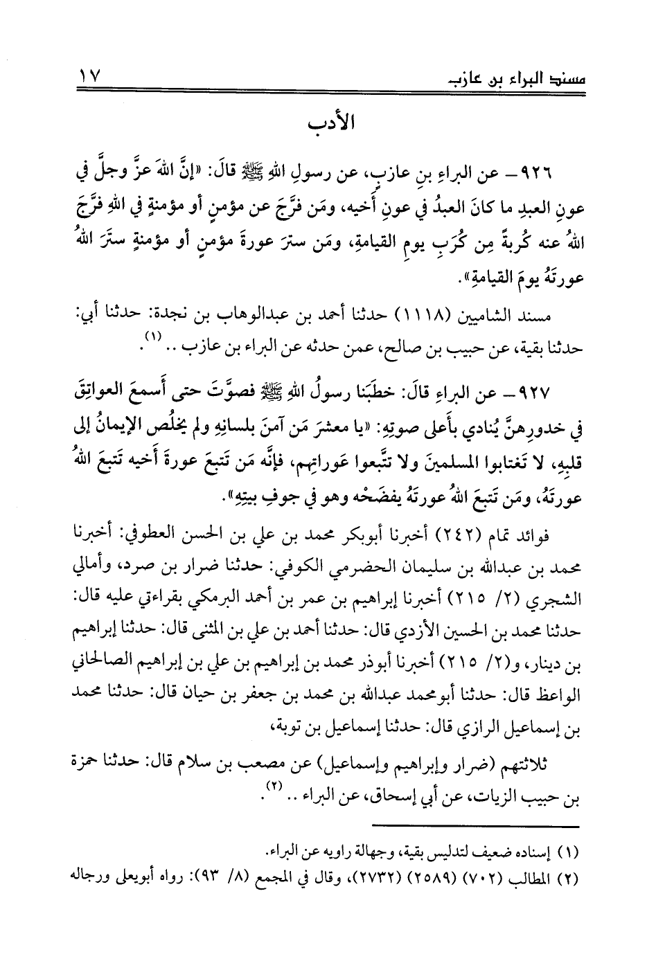 ثلاثتهم (ضرار وإبراهيم وإسماعيل) عن مصعب بن سلام قال: حدثنا حمزة بن حبيب الزيات، عن أبي إسحاق، عن البراء .. (¬2).