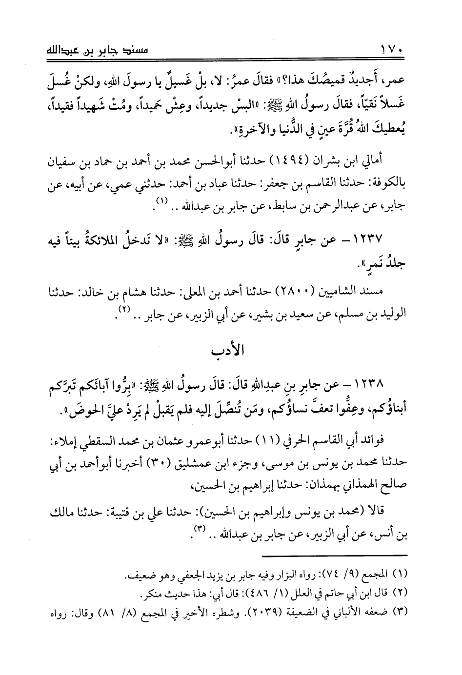 1238 - عن جابرِ بنِ عبدِاللهِ قالَ: قالَ رسولُ اللهِ صلى الله عليه وسلم: «بِرُّوا آبائَكم تَبرَّكم أبناؤُكم، وعِفُّوا تعفَّ نساؤُكم، ومَن تُنصِّلَ إليه فلم يَقبلْ لم يَرِدْ عليَّ الحوضَ».