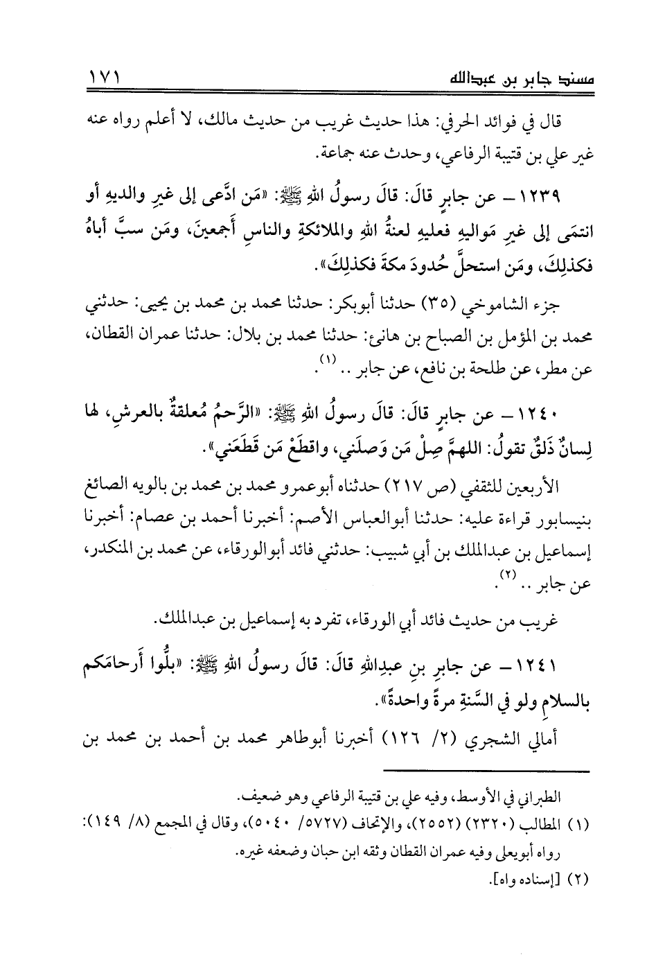 1239 - عن جابرٍ قالَ: قالَ رسولُ اللهِ صلى الله عليه وسلم: «مَن ادَّعى إلى غيرِ والديهِ أو انتمَى إلى غيرِ مَواليهِ فعليهِ لعنةُ اللهِ والملائكةِ والناسِ أَجمعينَ، ومَن سبَّ أباهُ فكذلِكَ، ومَن استحلَّ حُدودَ مكةَ فكذلِكَ».