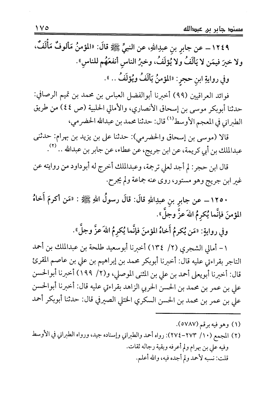 1249 - عن جابرِ بنِ عبدِاللهِ، عن النبيِّ صلى الله عليه وسلم قالَ: «المؤمنُ مَألوفٌ مَأْلَفٌ، ولا خيرَ فيمَن لا يَألَفُ ولا يُؤلَفُ، وخيرُ الناسِ أنفعَهُم للناسِ».
