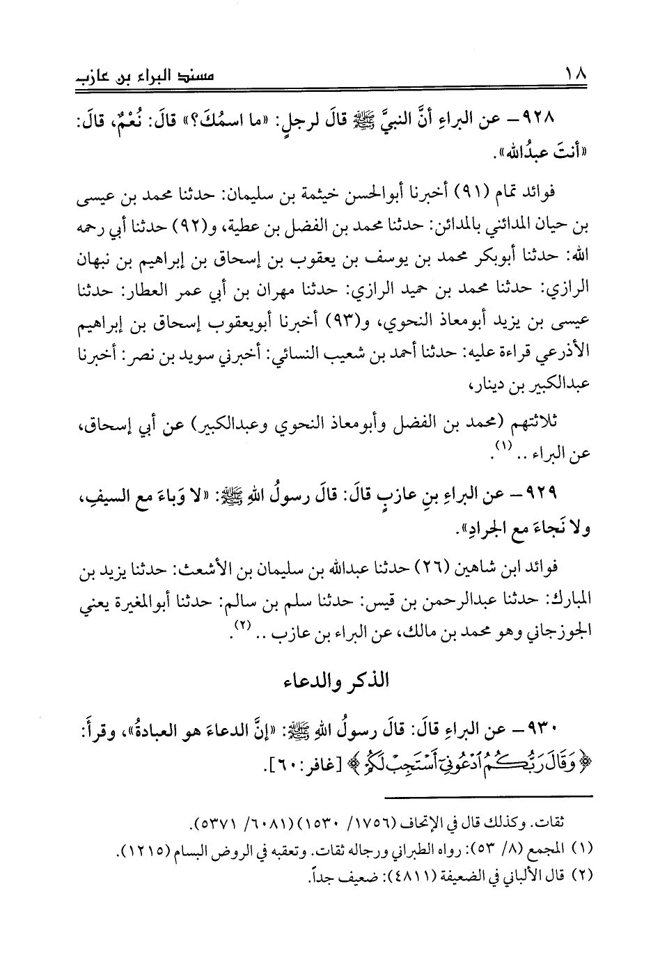 فوائد ابن شاهين (26) حدثنا عبدالله بن سليمان بن الأشعث: حدثنا يزيد بن المبارك: حدثنا عبدالرحمن بن قيس: حدثنا سلم بن سالم: حدثنا أبوالمغيرة يعني الجوزجاني وهو محمد بن مالك، عن البراء بن عازب .. (¬2).