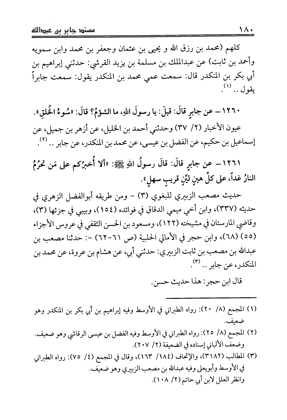 حديث مصعب الزبيري للبغوي (3) - ومن طريقه أبوالفضل الزهري في حديثه (337)، وابن أخي ميمي الدقاق في فوائده (154)، وبيبي في جزئها (3)، وقاضي المارستان في مشيخته (122)، ومسعود بن الحسن الثقفي في عروس الأجزاء (55) (68)، وابن حجر في الأمالي الحلبية (ص 61 - 62) -: حدثنا مصعب بن عبدالله بن مصعب بن ثابت الزبيري: حدثني أبي، عن هشام بن عروة، عن محمد بن المنكدر، عن جابر .. (¬3).