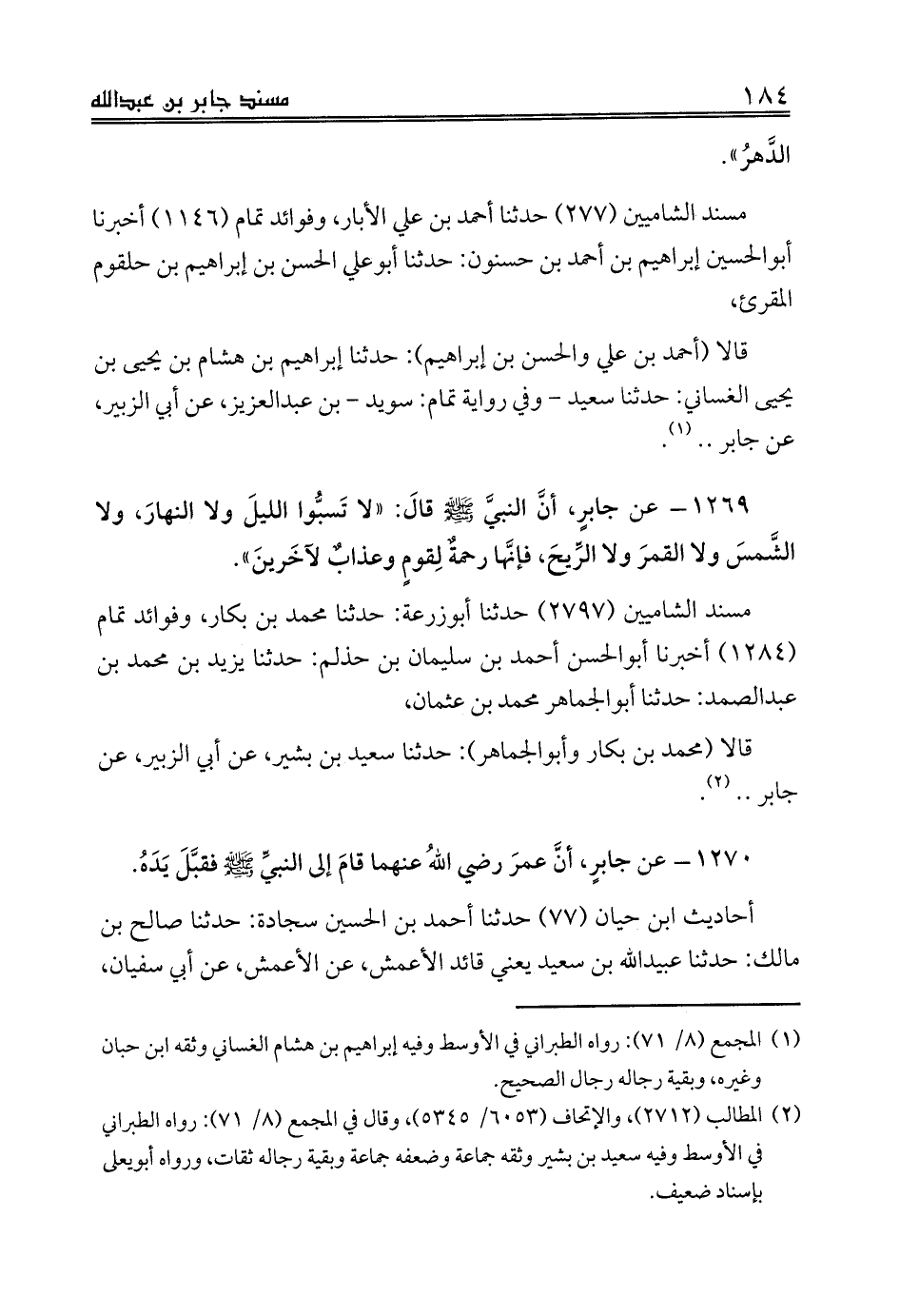 1269 - عن جابرٍ، أنَّ النبيَّ صلى الله عليه وسلم قالَ: «لا تَسبُّوا الليلَ ولا النهارَ، ولا الشَّمسَ ولا القمرَ ولا الرِّيحَ، فإنَّها رحمةٌ لِقومٍ وعذابٌ لآخَرينَ».