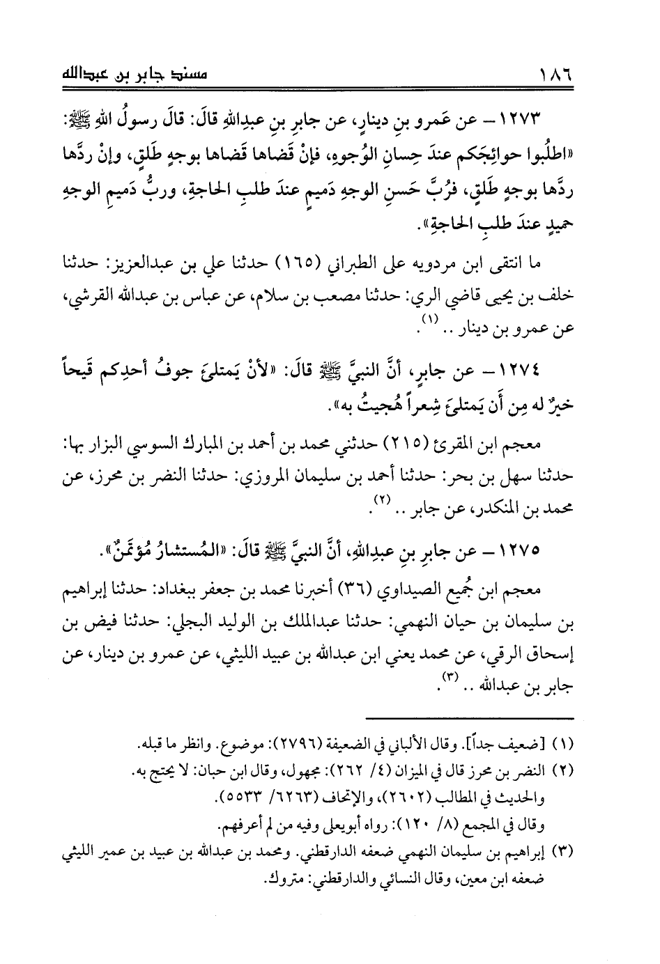 1273 - عن عَمرو بنِ دينارٍ، عن جابرِ بنِ عبدِاللهِ قالَ: قالَ رسولُ اللهِ صلى الله عليه وسلم: «اطلُبوا حوائِجَكم عندَ حِسانِ الوُجوهِ، فإنْ قَضاها قَضاها بوجهٍ طَلقٍ، وإنْ ردَّها ردَّها بوجهٍ طَلقٍ، فرُبَّ حَسنِ الوجهِ دَميمٍ عندَ طلبِ الحاجةِ، وربُّ دَميمِ الوجهِ حميدٍ عندَ طلبِ الحاجةِ».