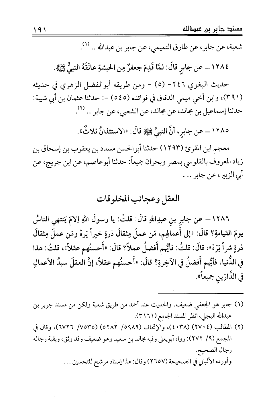 1286 - عن جابرِ بنِ عبدِاللهِ قالَ: قلتُ: يا رسولَ اللهِ إلامَ يَنتهي الناسُ يومَ القيامةِ؟ قالَ: «إلى أَعمالِهم، مَن عملَ مِثقالَ ذرةٍ خيراً يَرهْ ومَن عملَ مِثقالَ ذرةٍ شراً يَرَهْ»، قالَ: قلتُ: فأيُّهم أَفضلُ عملاً؟ قالَ: «أَحسنُهم عقلاً»، قلتُ: هذا في الدُّنيا، فأيُّهم أَفضلُ في الآخِرةِ؟ قالَ: «أَحسنُهم عقلاً، إنَّ العقلَ سيدُ الأعمالِ في الدَّارَينِ جميعاً».