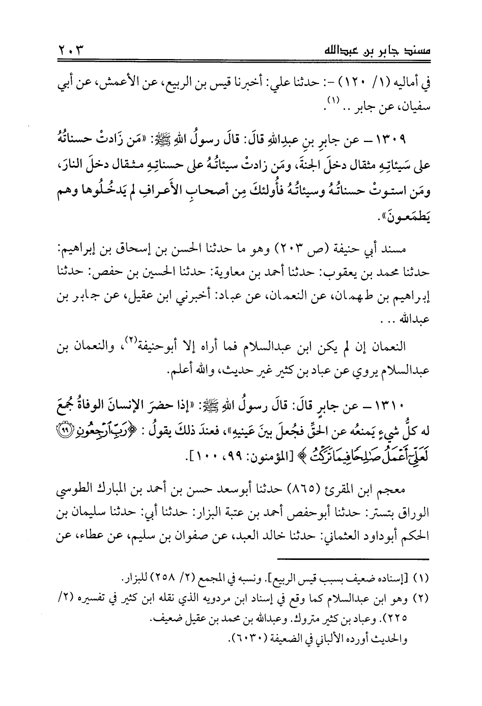 مسند أبي حنيفة (ص 203) وهو ما حدثنا الحسن بن إسحاق بن إبراهيم: حدثنا محمد بن يعقوب: حدثنا أحمد بن معاوية: حدثنا الحسين بن حفص: حدثنا إبراهيم بن طهمان، عن النعمان، عن عباد: أخبرني ابن عقيل، عن جابر بن عبدالله .. .